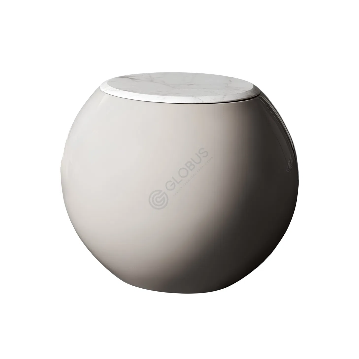The table top is crafted from natural marble, showcasing its inherent beauty and unique veining patterns in shades of grey and white. Each marble slab tells its own visual story, ensuring no two tables are exactly alike. The bowl-shaped base, made from durable plywood, provides a clean, solid foundation that complements the distinctive stone surface.