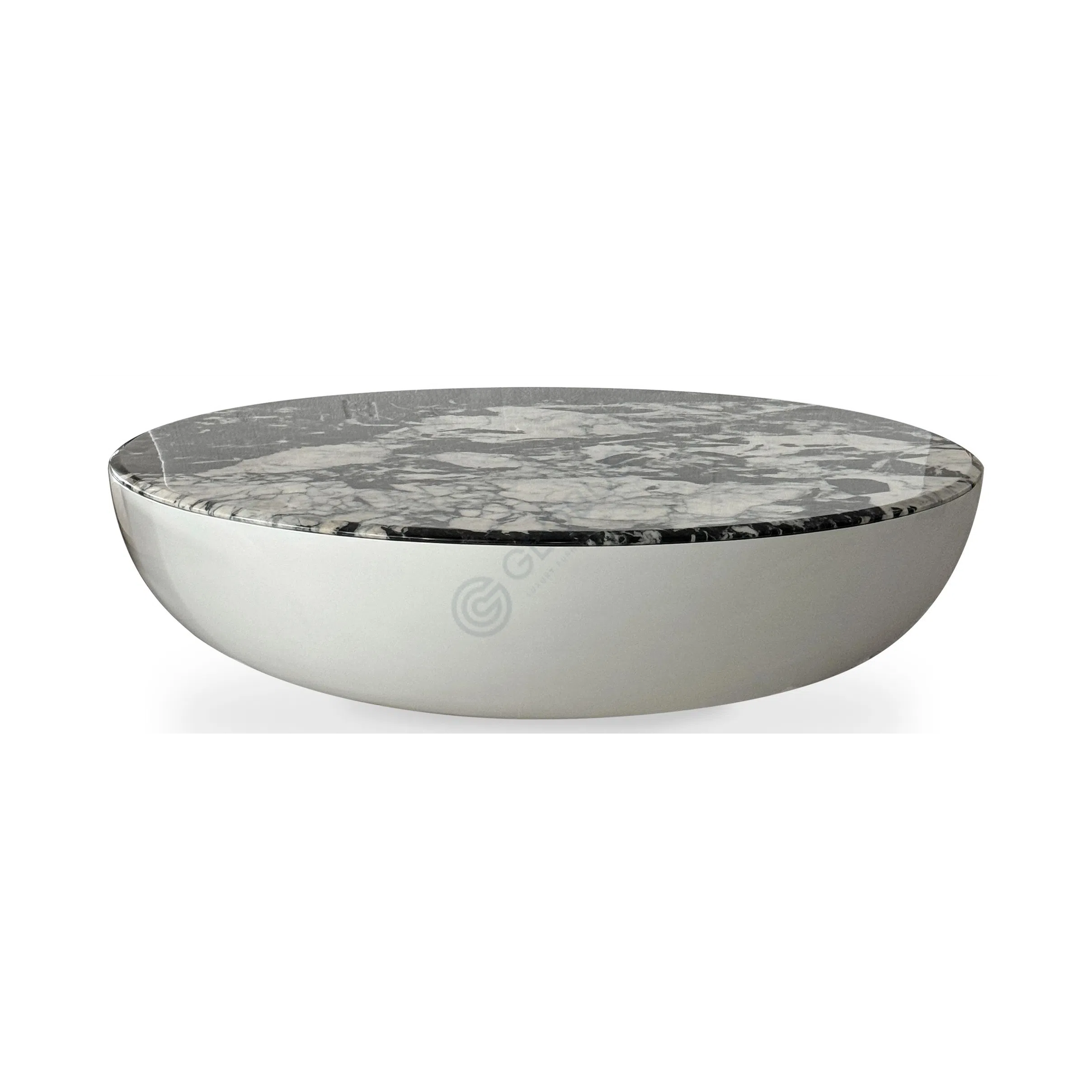 The design features a beautiful natural marble top, showcasing unique veining and polished elegance. This luxurious surface is complemented by a robust structure, likely crafted from quality plywood and finished to a smooth, tactile surface, creating a pleasing contrast in textures and materials.