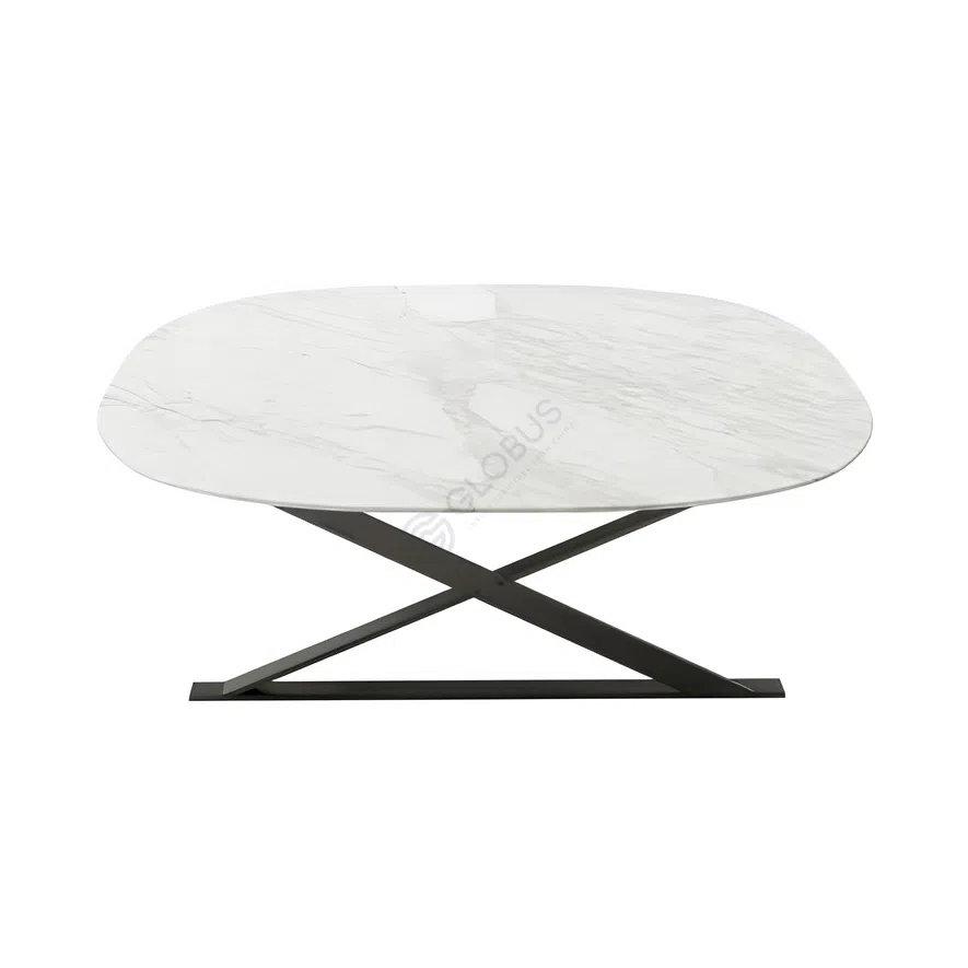A sleek side table presenting a beautiful balance of natural marble and metal. The elegant tabletop, crafted from natural marble, features a smooth, rounded surface. It rests upon a minimalist metal base, composed of slender upright supports joined by a circular ring at the bottom, creating a light yet stable structure.
