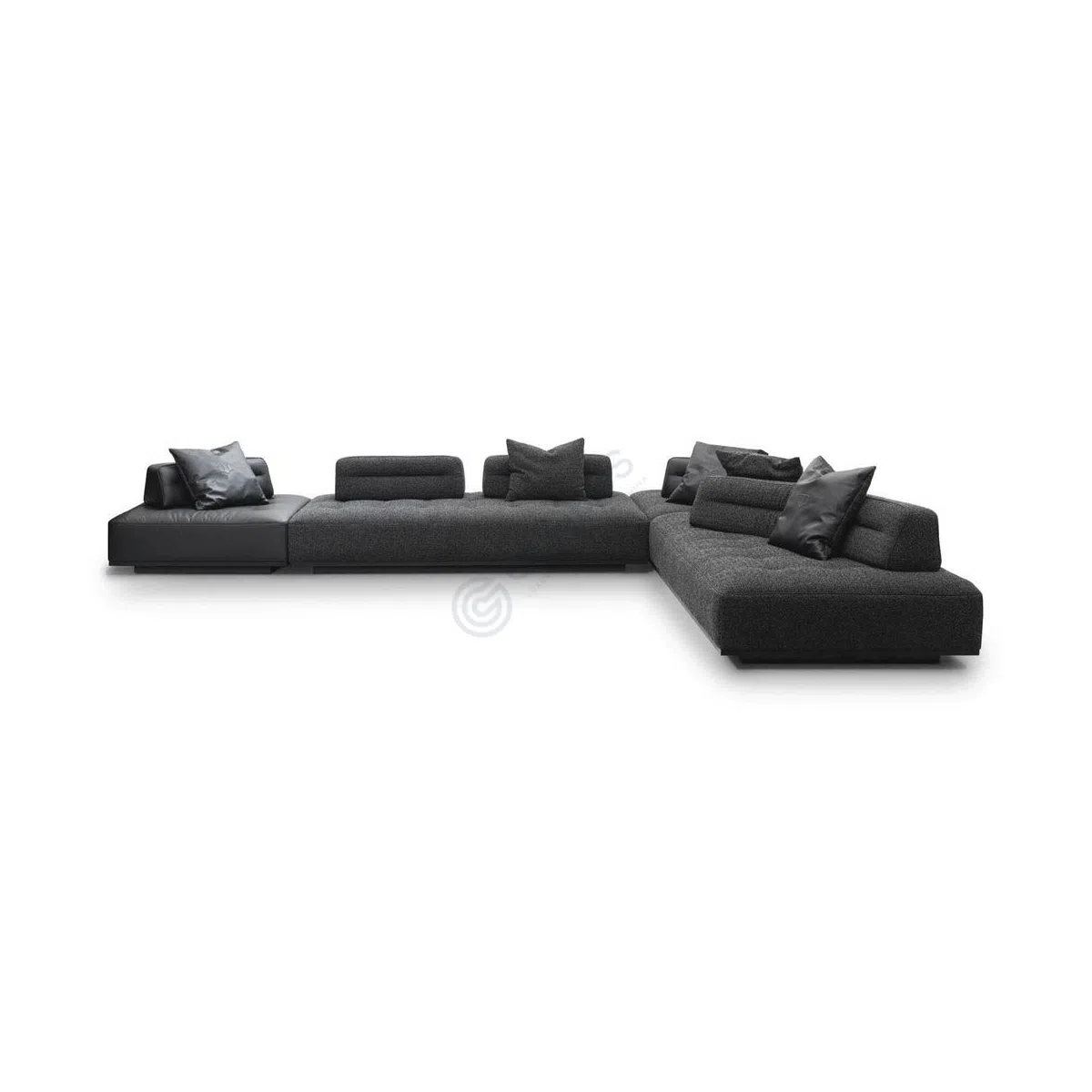 This modern bed presents a low, inviting profile, featuring generous padding around the base for a plush aesthetic. Its broad structure extends outwards, creating a comfortable, grounded presence within the room. The design speaks of relaxed luxury and contemporary comfort.