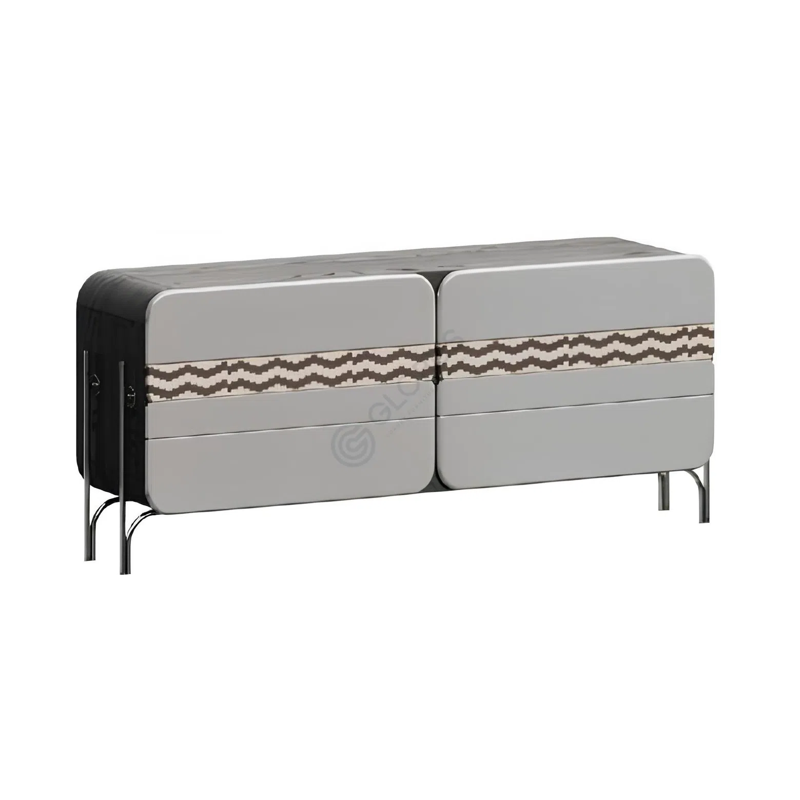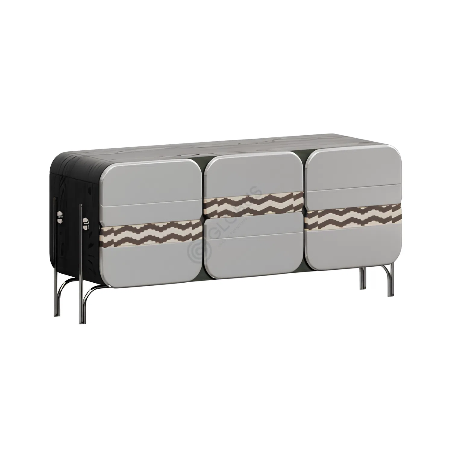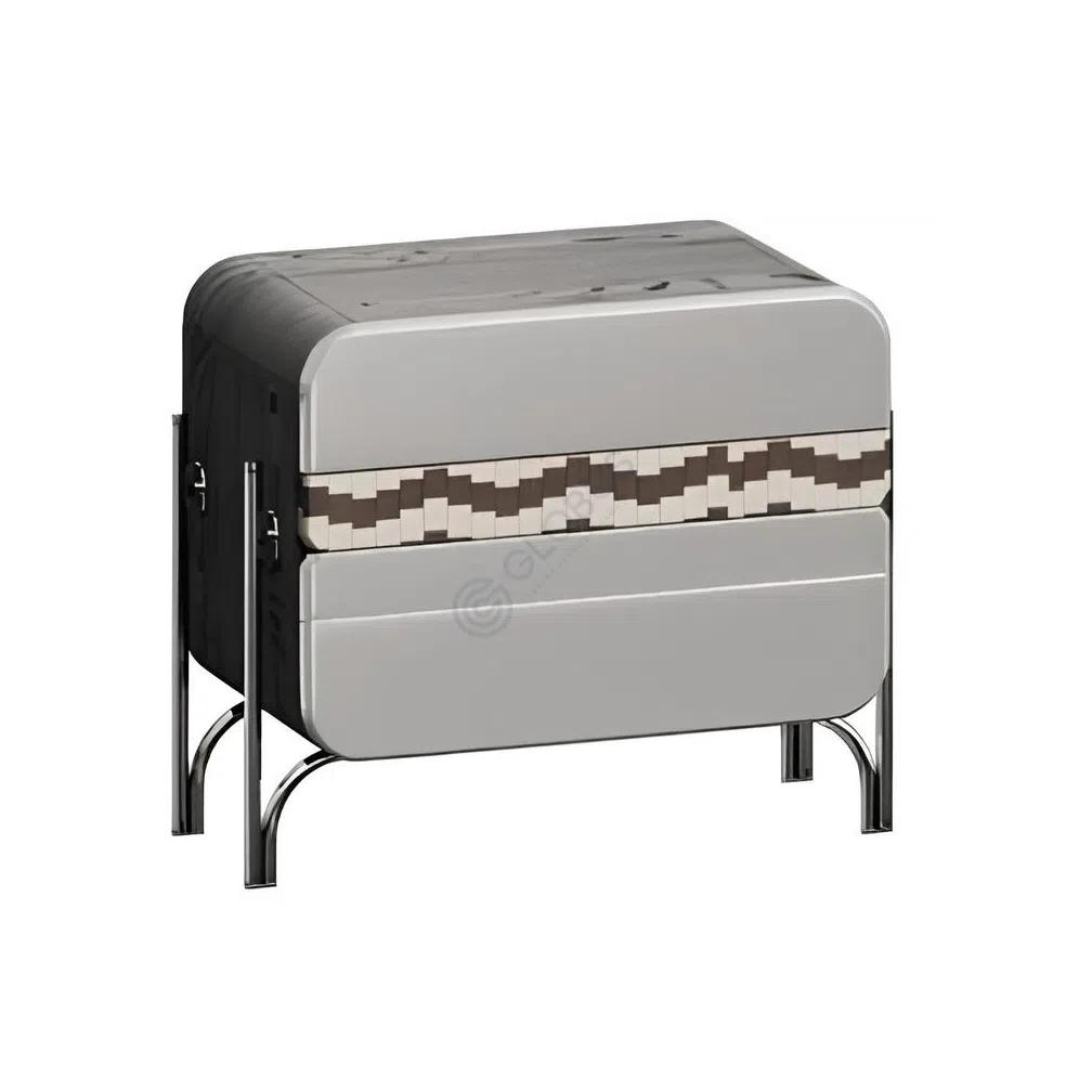 Crafted from durable plywood and MDF, the cabinet is finished with rich natural veneer for a touch of organic beauty. Its face features a striking contrast, combining a smooth surface with an intricate geometric pattern. Sleek stainless steel forms the supportive base and subtle hardware, enhancing the modern aesthetic.