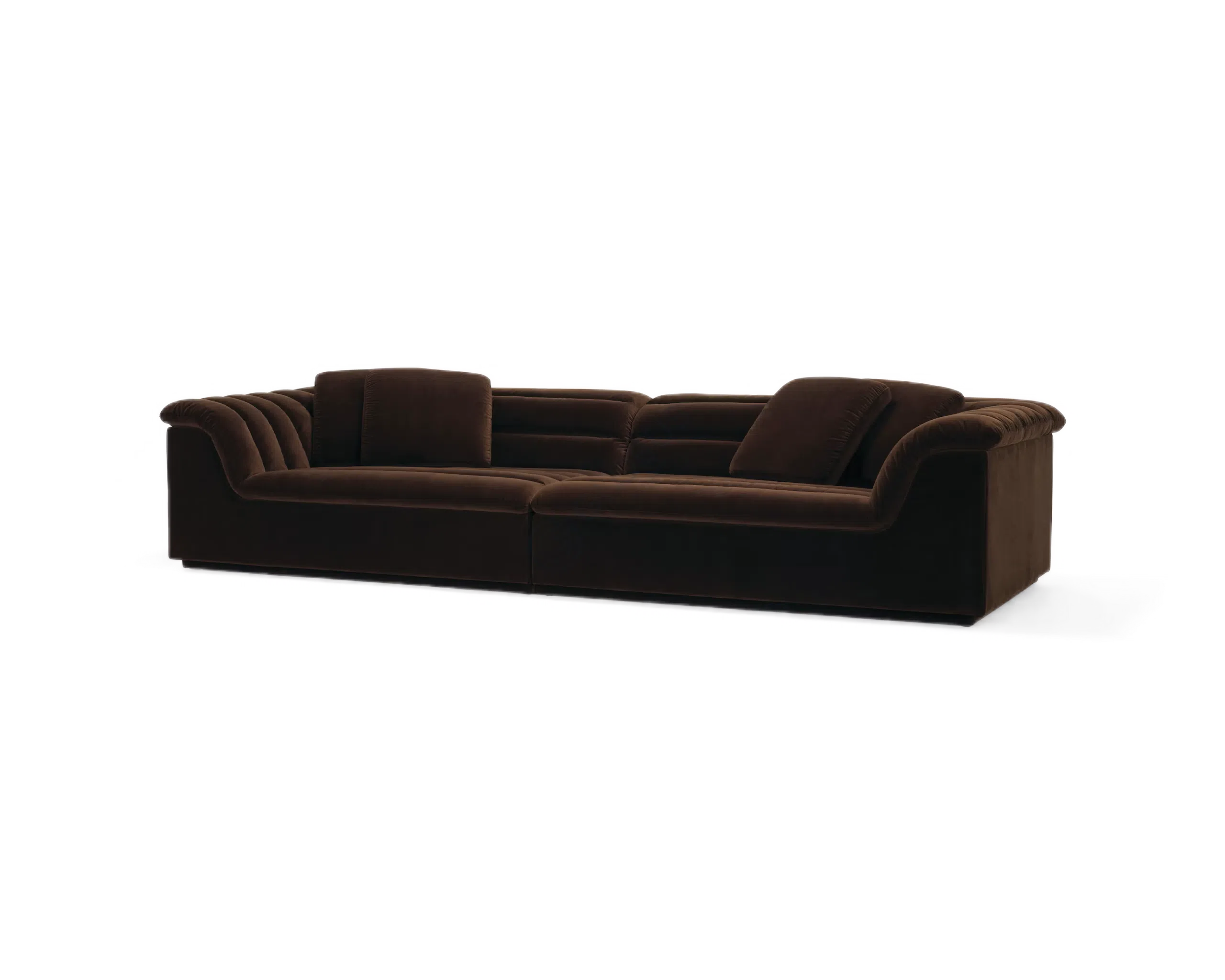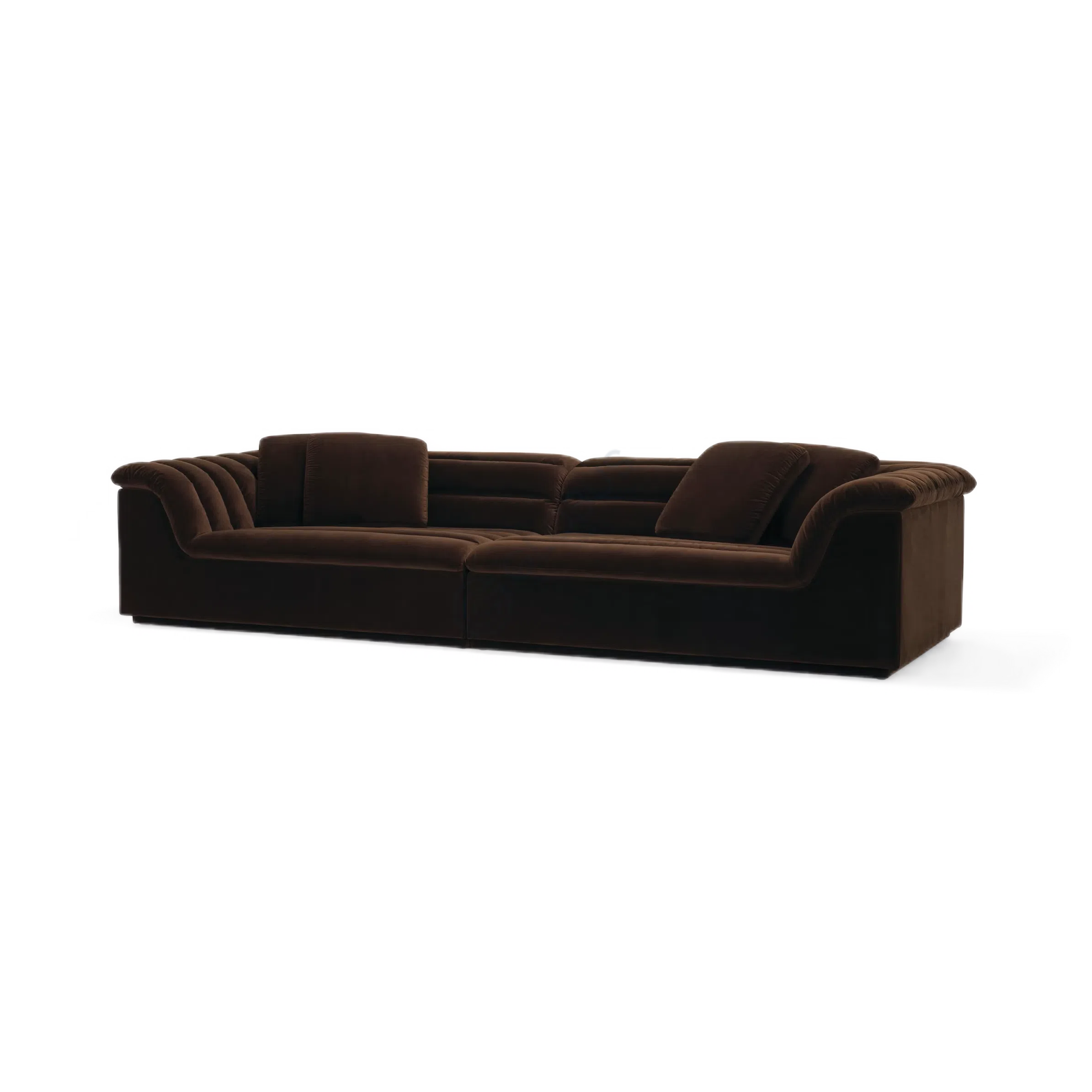 This pouf presents a sophisticated modern design, featuring a rich, dark brown textile upholstery. The top cushion is generously padded and detailed with elegant horizontal channeling, offering both visual interest and inviting softness. Its clean lines and refined finish provide a contemporary aesthetic that complements various interior styles.