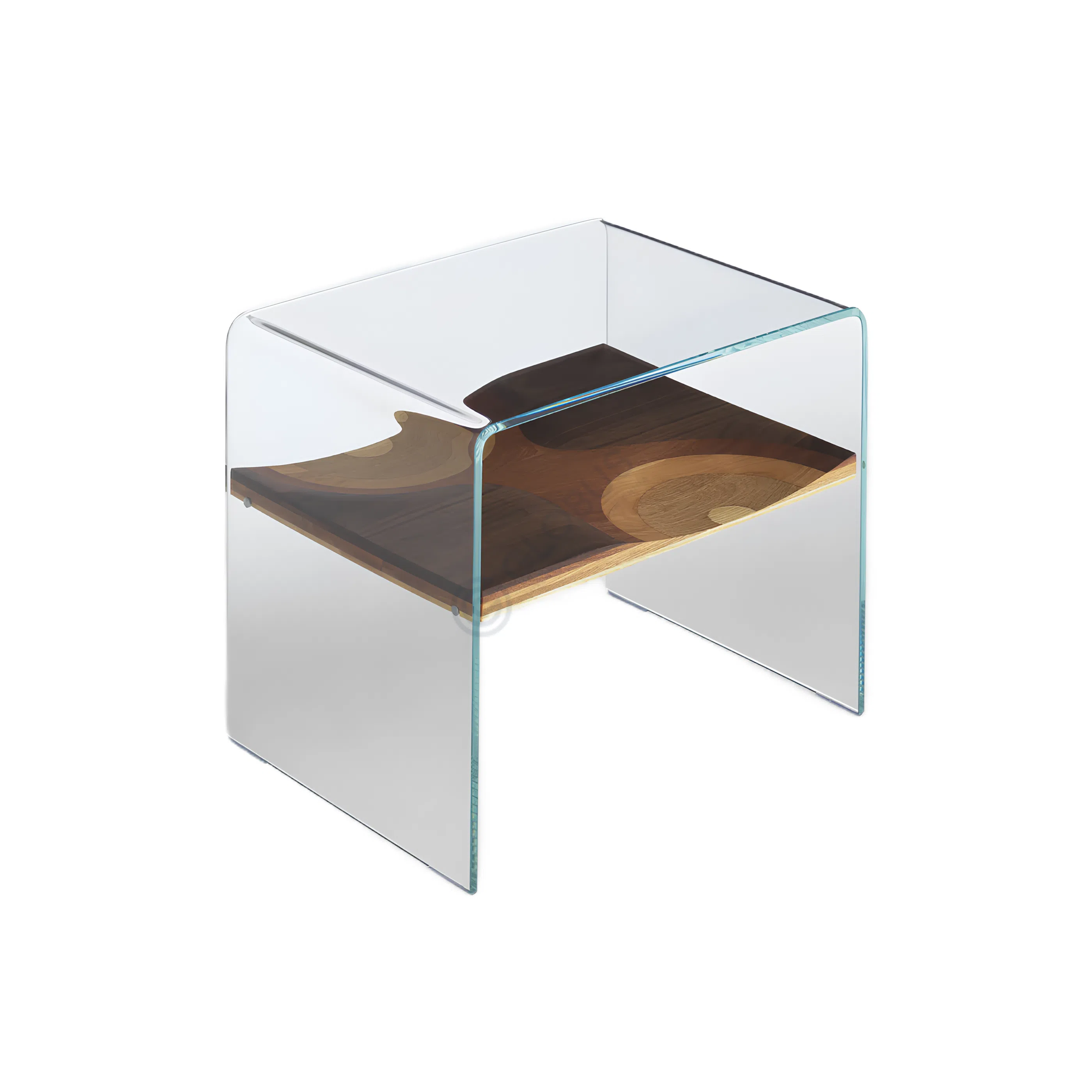 Nestled within the clear acrylic is a gracefully curved shelf crafted from solid wood. The natural warmth of the wood, with its distinctive grain pattern, provides a striking contrast to the clarity of the acrylic. This elegant interplay of materials highlights both natural beauty and contemporary design.