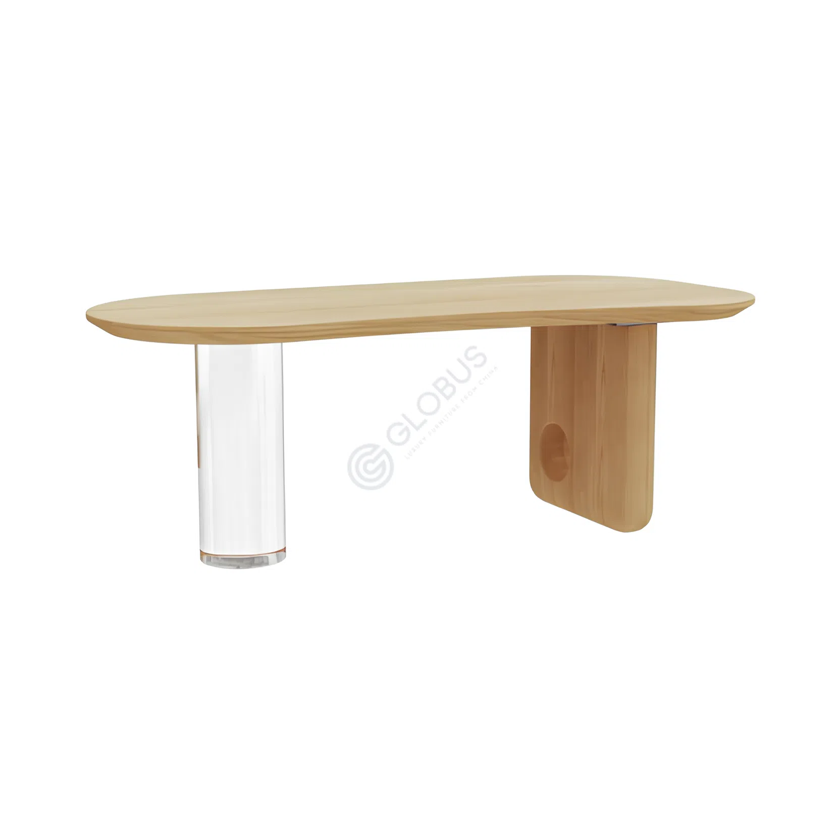 Adding a contemporary touch, the table's base seamlessly merges contrasting elements. One side is supported by a sleek acrylic cylinder, lending a sense of lightness, while the solid wood leg adds structure and stability. The clean lines and elegant geometry ensure this piece effortlessly complements a modern interior.