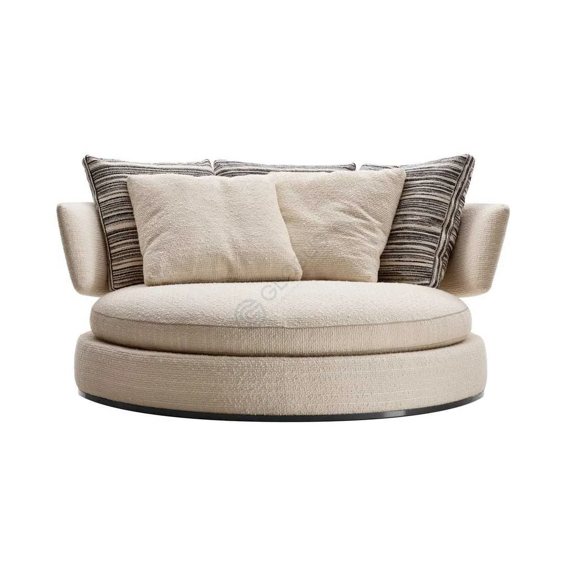 The softly textured textile upholstery in a neutral shade adds a refined touch, while generously filled feather cushions provide a relaxed and supportive seating experience. Striped accent pillows bring subtle contrast and depth, enhancing its visual appeal.
