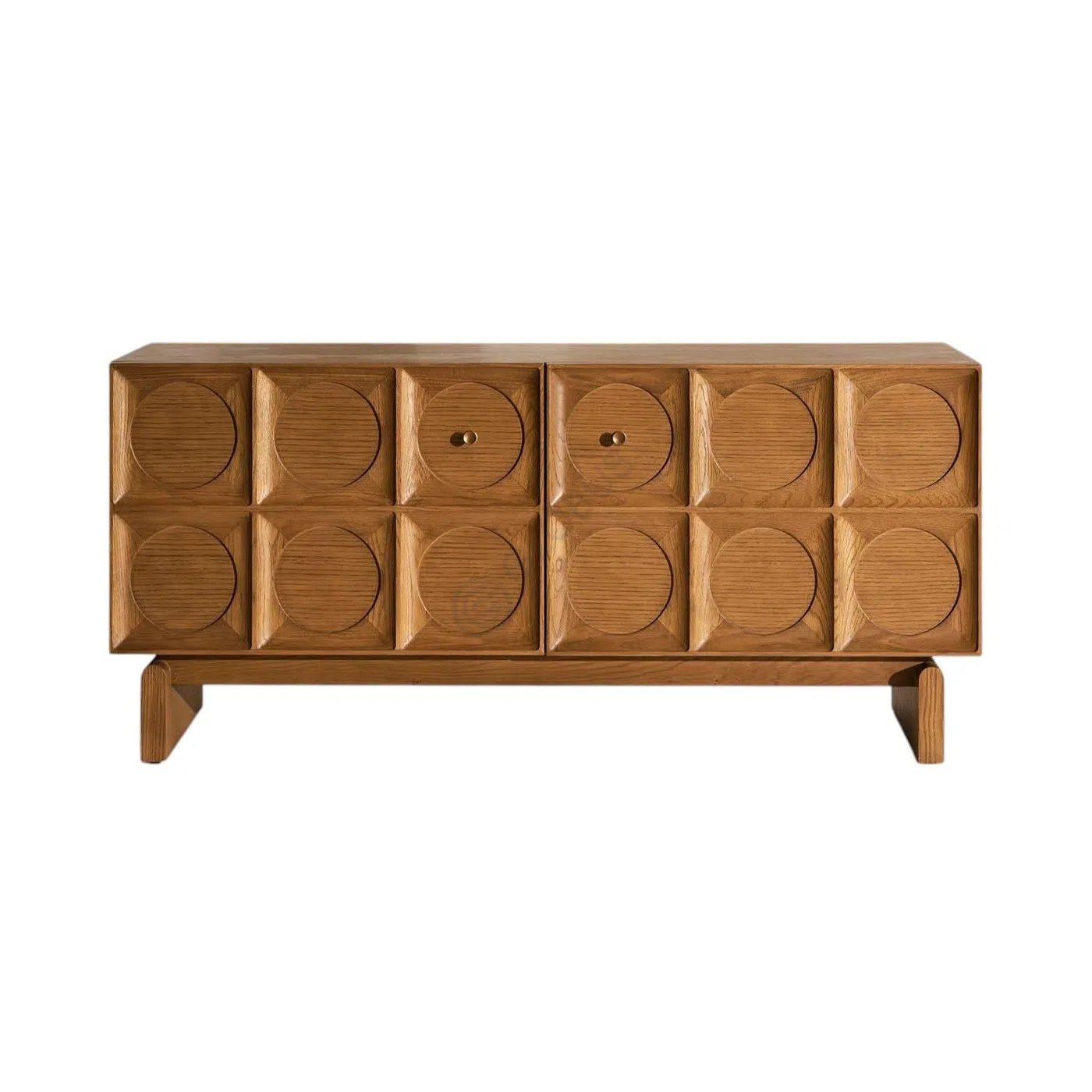 The table features a unique geometric facade with intricately carved details that give it a distinctive look while maintaining functionality. The drawer handles are subtly incorporated, ensuring easy access without disrupting the table's seamless design.