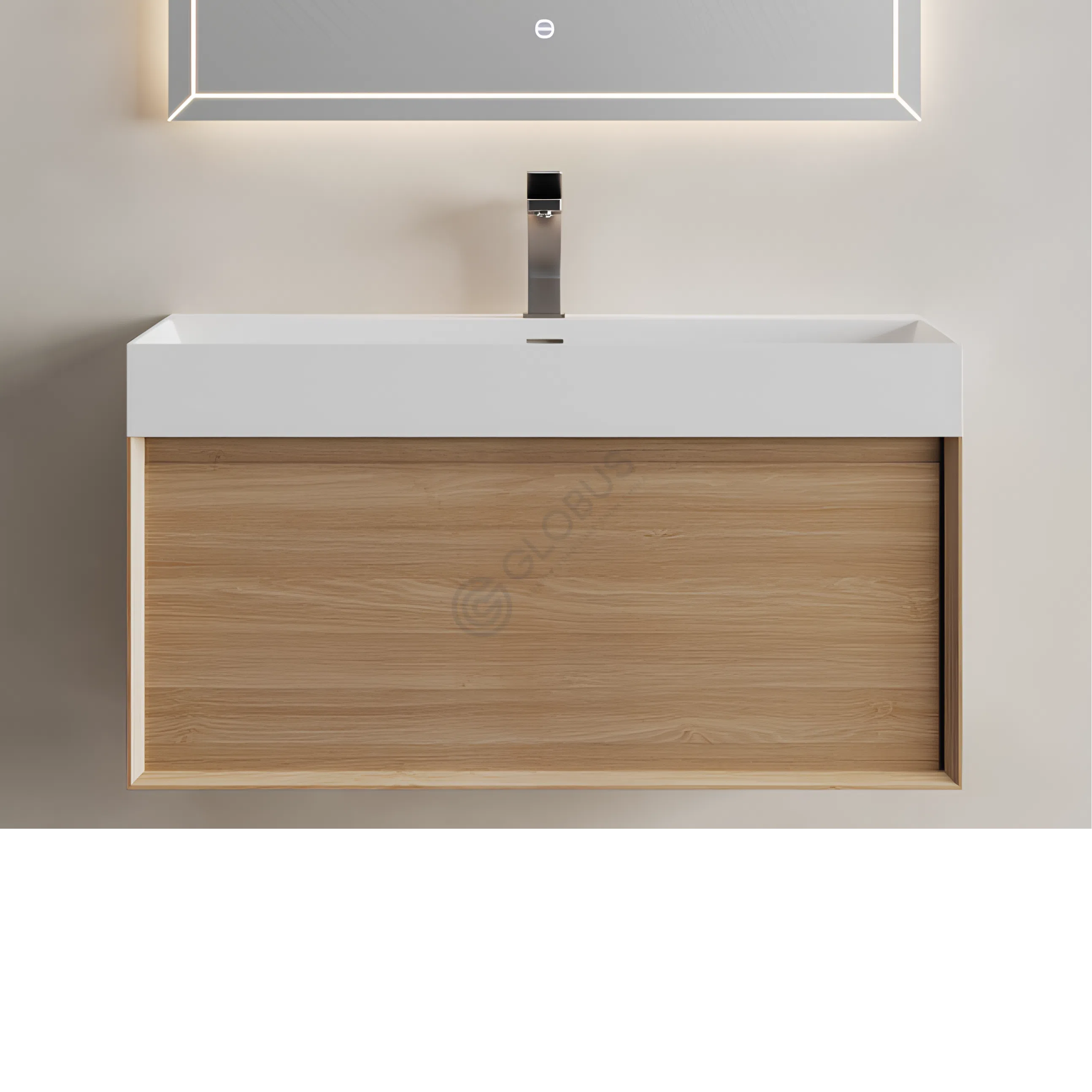 Integrated LED lighting surrounds the mirror, creating a soft, ambient glow. The lighting not only enhances the aesthetic but also provides practical illumination for daily activities, making it both stylish and functional.