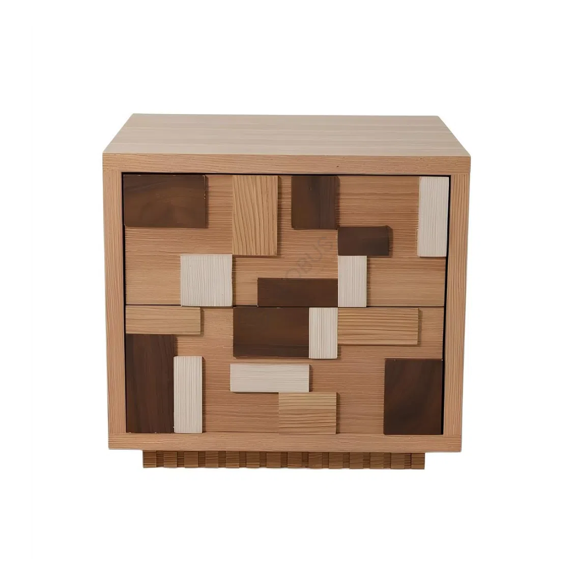 The standout feature of this cabinet is the unique geometric pattern on its front panels, created with a harmonious mix of natural wood tones. This design adds depth and visual interest while maintaining a clean, modern appeal. The natural wood grain serves to enhance its character and warmth.