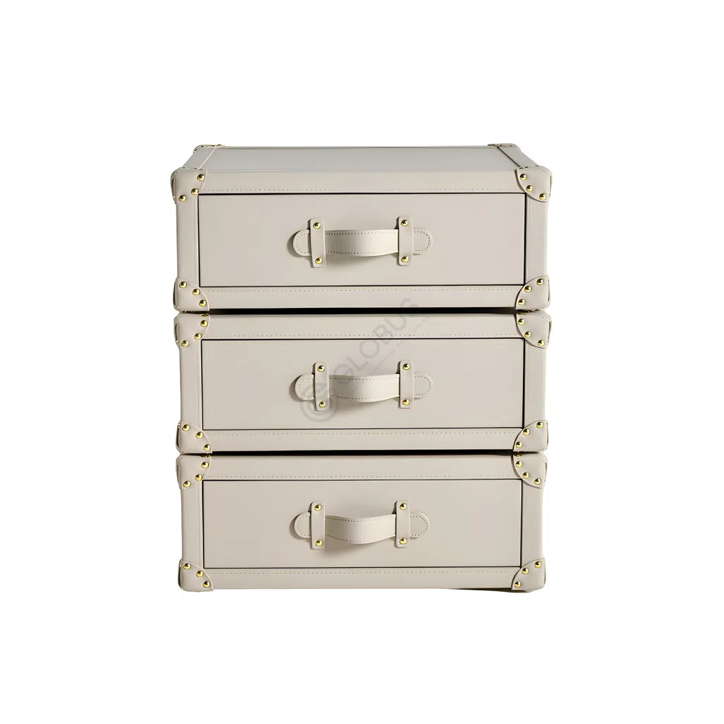 The wardrobe features a thoughtful configuration of spacious compartments and drawers, providing practical storage for clothing and accessories. The clean lines and neutral tone create a calm, organized atmosphere, while the smooth casters add convenient mobility.