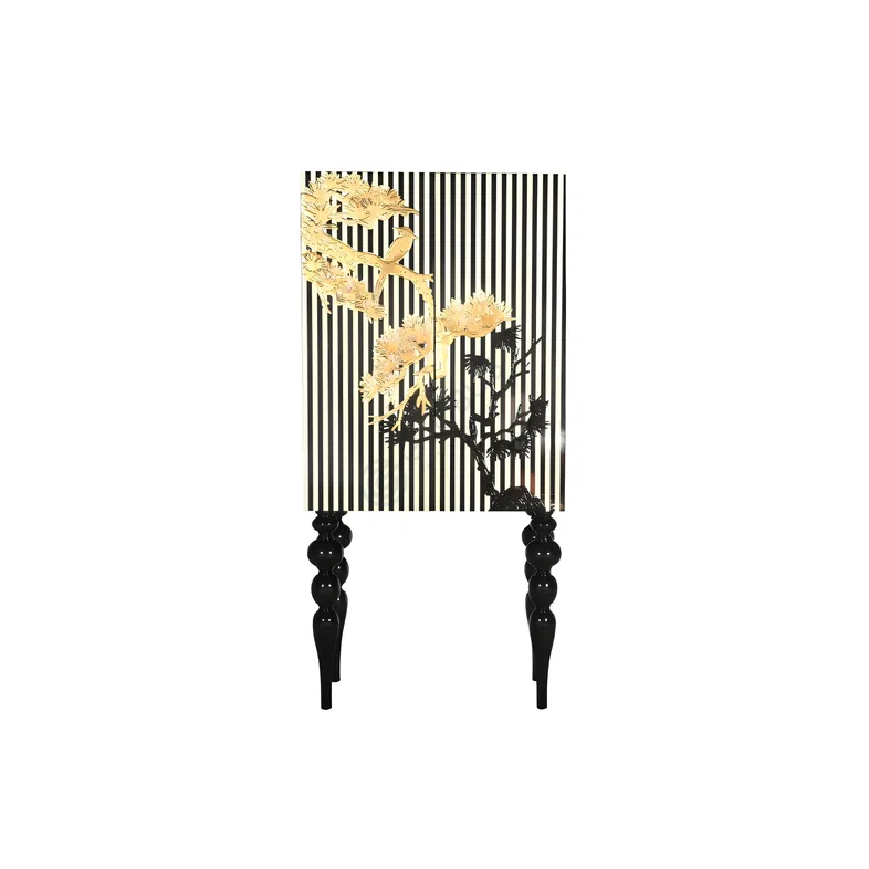 This cabinet blends bold design with timeless elegance, creating a standout piece for any modern or Art Deco-inspired space. The structure is crafted from a combination of solid wood and durable MDF, ensuring lasting quality and stability. Its surface features a striking black-and-white striped pattern, which serves as the perfect backdrop for the intricate copper detailing of birds and tree branches.