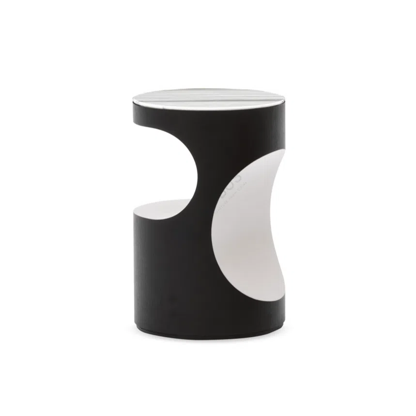 The unique design features smooth curves and cutouts in the plywood base, creating a striking combination of form and functionality. The geometric voids offer a lightweight visual appeal while providing additional storage or display options for small items.