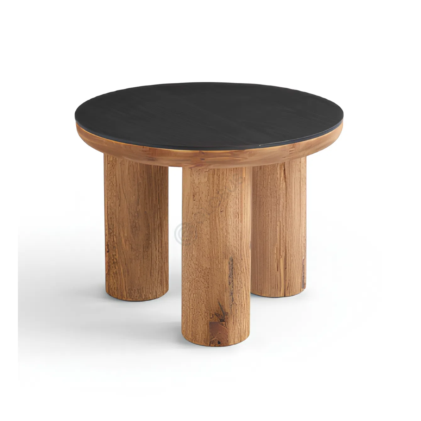 The solid wood cylindrical legs provide strength and durability, creating a stable foundation that supports the structure. Their warm, natural wood tone contrasts elegantly with the dark tabletop, giving the table a distinctive and sophisticated look. The grain and texture of the wood bring an organic element to the piece, enhancing its unique character.