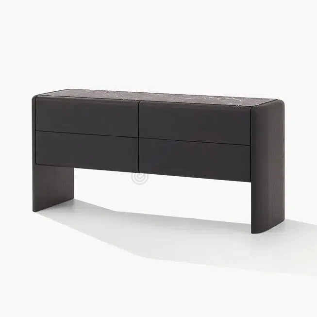 The streamlined structure features spacious storage compartments, seamlessly integrated to reduce clutter and keep your space organized. The natural marble with subtle veining adds a touch of elegance, while the rounded edges and clean lines highlight its contemporary appeal.