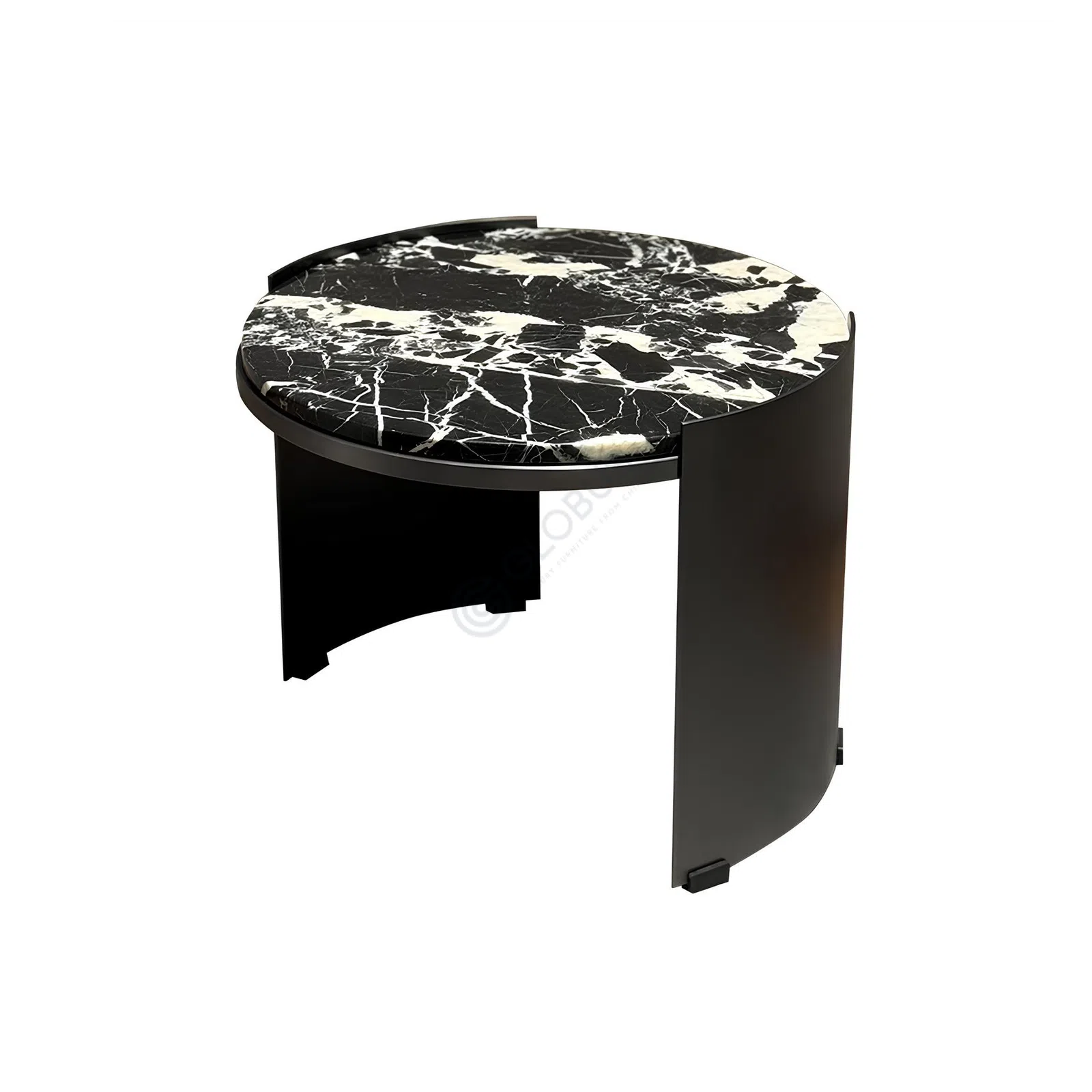 This coffee table presents a striking modern silhouette, defined by a rounded form and clean lines that fit effortlessly in any contemporary living room. Its wide top features a dramatic inlay of natural marble, providing an elegant focal point that adds both visual interest and a touch of sophistication.