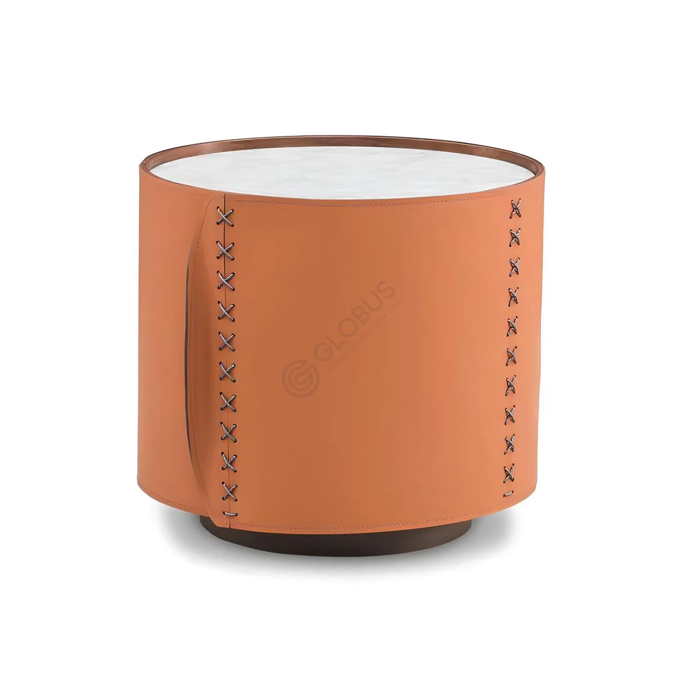 A round coffee table crafted from natural marble, saddle leather, and plywood brings refined modern style to the living room. The smooth marble top, cool and polished, provides a clean surface that contrasts elegantly with the warmth of saddle leather wrapped around the base.