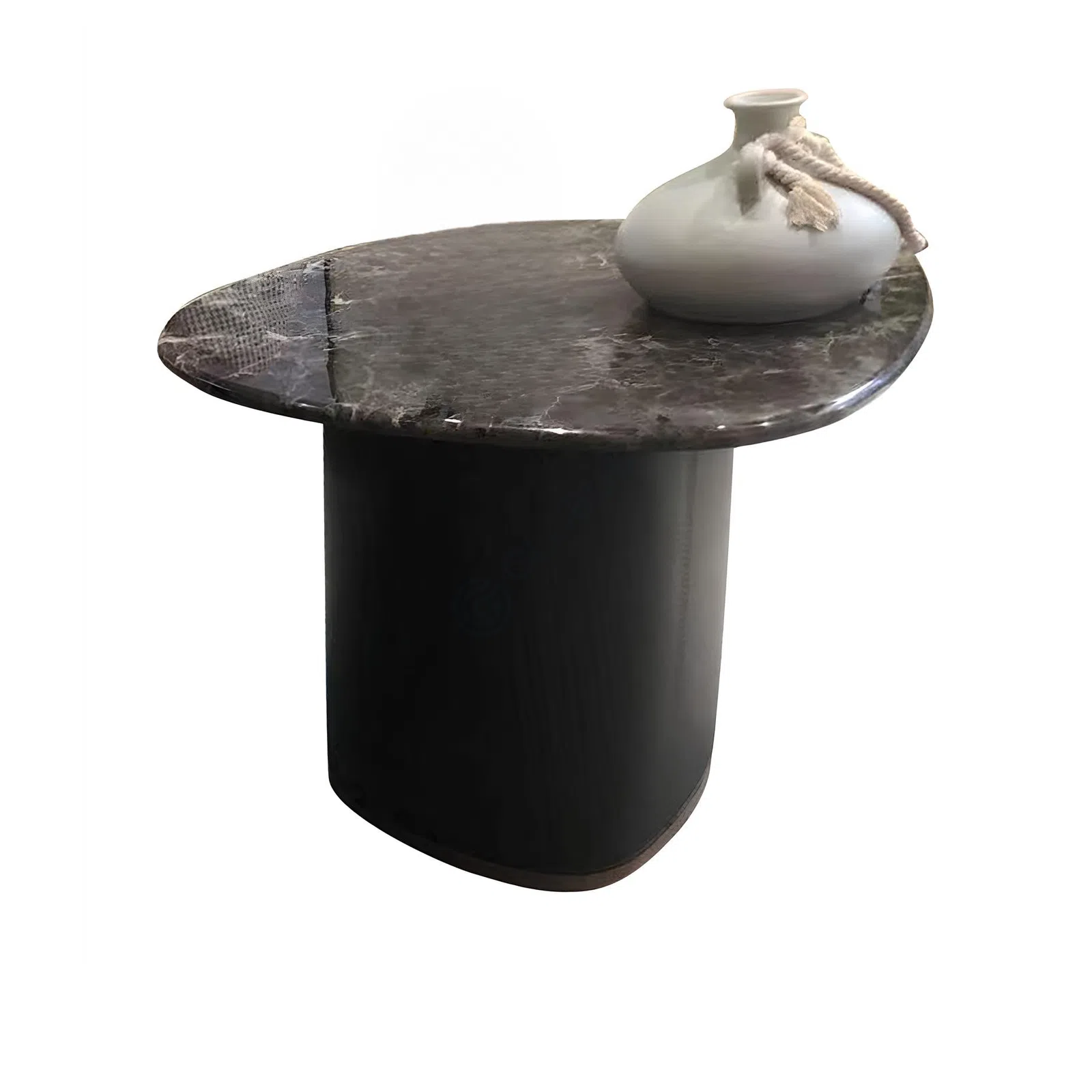 This modern coffee table features a striking oval top crafted from natural marble, displaying unique veining and a polished surface that elevates any living room setting. The dark marble contrasts elegantly with the solid wood base, providing a sense of stability and warmth.