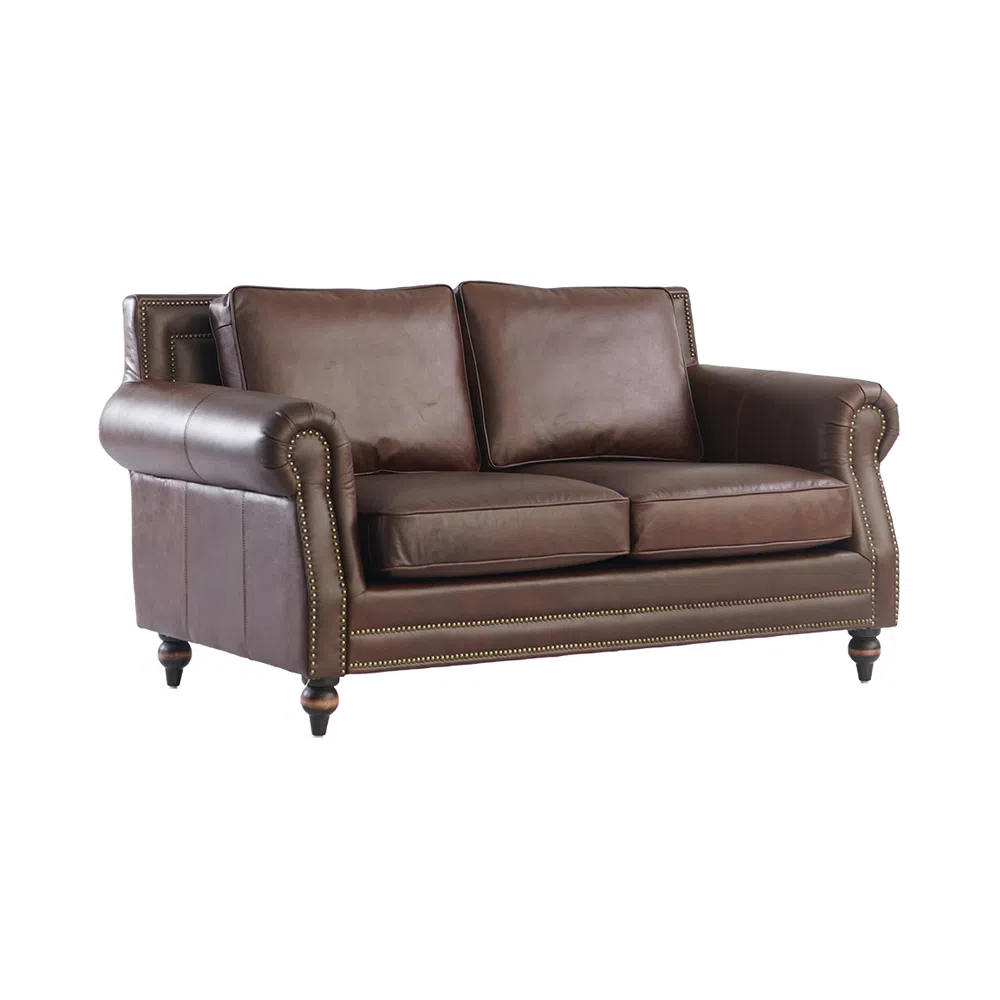 This armchair brings a refined American classic aesthetic to any living room, combining the warmth of solid wood with the timeless appeal of rich brown leather. The smooth leather upholstery is complemented by carefully finished details, including hand-applied nailhead trim that outlines the frame and gives the piece a tailored look.