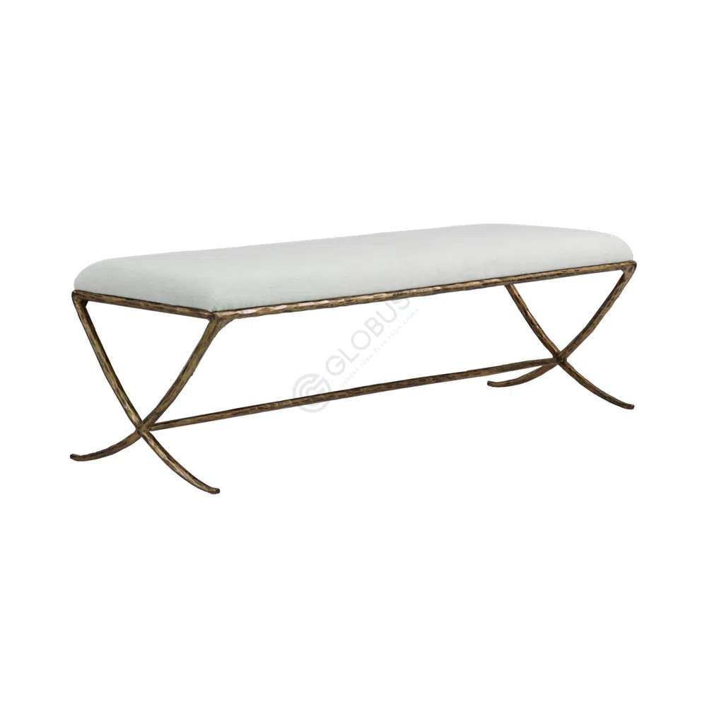 This modern pouf combines refined textile upholstery with a sleek iron frame, offering a sophisticated addition to any setting. Its plush, light-toned seat provides comfort, while the sculptural iron base, finished in a warm metallic tone, adds a unique geometric accent.