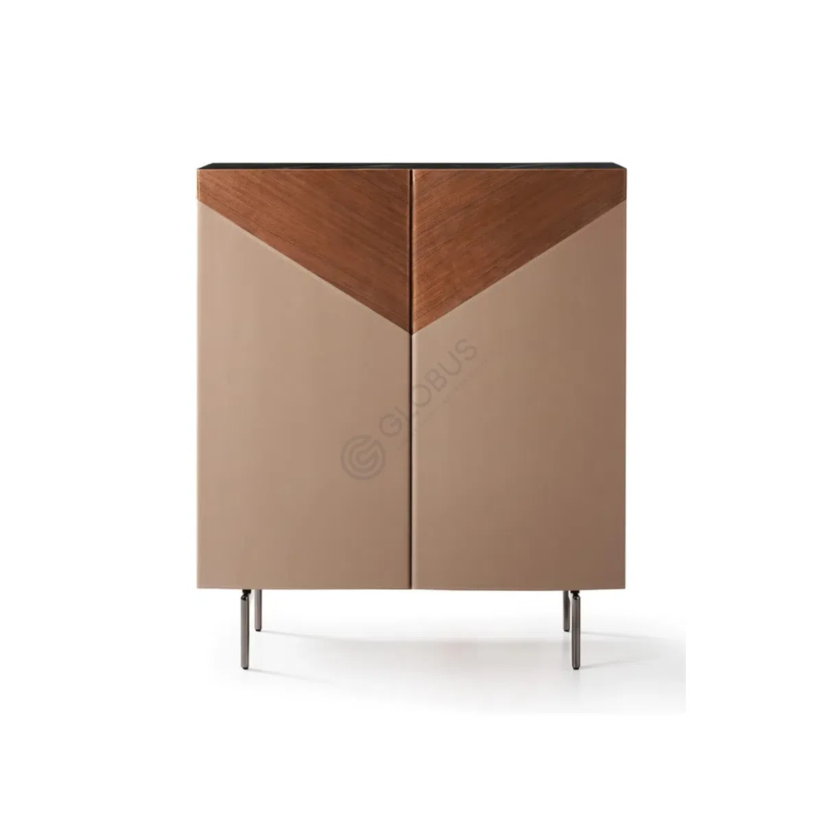 A modern TV stand with a refined, low profile, it pairs a deep-toned natural marble top with clean, geometric fronts. The doors form a subtle V-pattern in natural veneer, set against smooth Eco Saddle Microfiber in a warm taupe shade. Slim stainless-steel legs lift the piece lightly from the floor, keeping the silhouette elegant and airy.