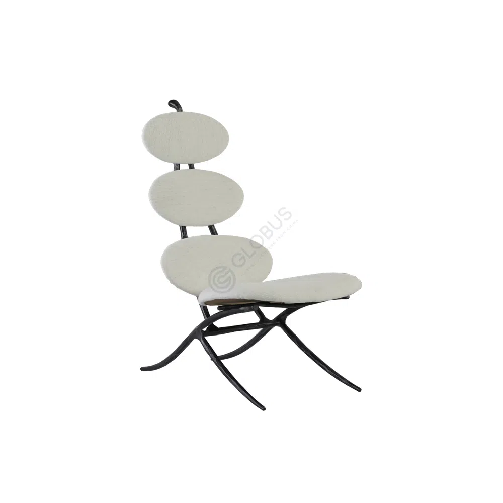 The innovative backrest, composed of three generously padded oval cushions, adapts to the body's natural contours. A gently curved seat complements this design, promoting relaxation. Sleek, dark armrests with a flat top provide a comfortable resting point, subtly contrasting with the frame's metallic hue.