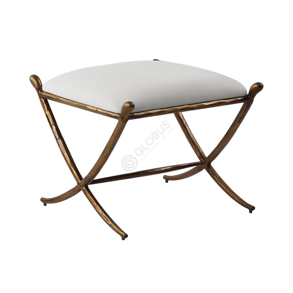 The sturdy iron frame showcases a beautiful, antiqued finish, offering a warm contrast to the light upholstery. Its distinct X-shaped legs and a minimalist connecting bar create a balanced and visually appealing structure, ensuring stability while contributing to the ottoman's elegant aesthetic.