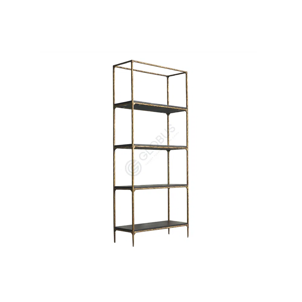 A tall, narrow bookshelf with an iron frame in a warm brass tone, shaped by subtle hand-texture for a refined loft look. Five open tiers sit within the rounded-square structure, each shelf finished with natural veneer over durable plywood in a deep, understated shade.