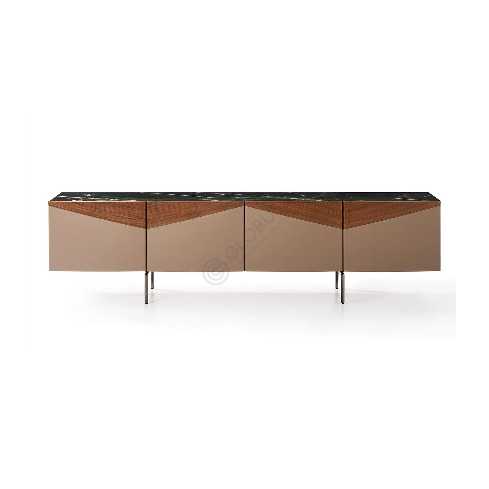 A modern cabinet defined by clean lines and a balanced mix of materials. A natural marble top in deep charcoal rests above geometric door fronts clad in eco saddle microfiber and accented with warm natural veneer triangles. Slim stainless steel legs lift the form, creating a light visual profile that suits living rooms, dining areas or kitchens.