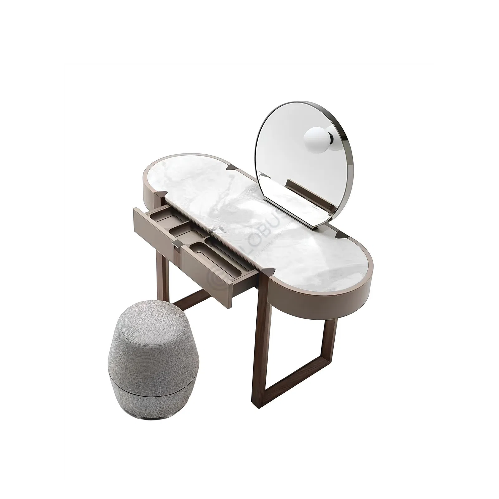 Its compact footprint suits a hallway corridor or living room entry, while the generous surface accommodates decorative accents, a mirror, or bedside essentials in a bedroom. The combination of durable materials ensures stable support and easy care—wiping the marble clean with a damp cloth and maintaining the microfiber with a gentle brush.