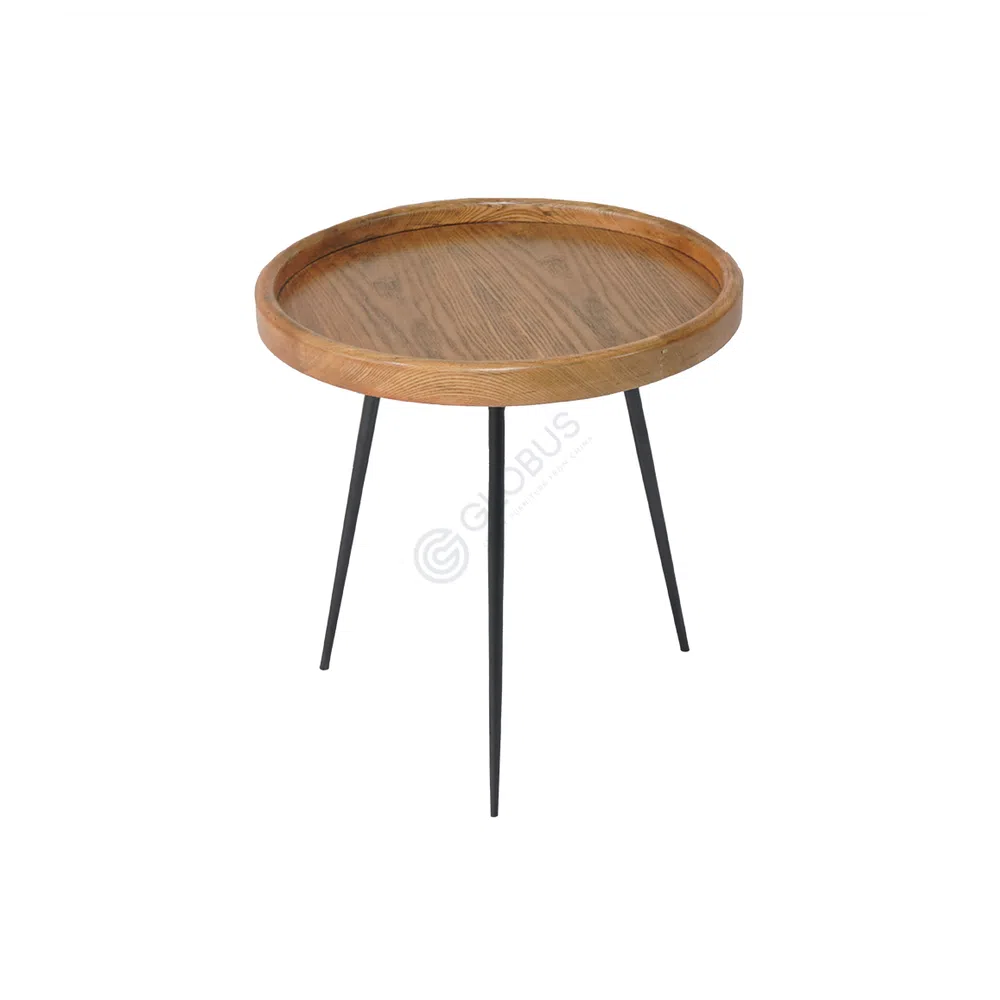 The table rests on sleek, slender iron legs, finished in a dark tone that creates a striking contrast with the wooden surface. This minimalist base contributes to the table’s light and airy presence, ensuring it integrates seamlessly into contemporary interiors without overwhelming the room. It serves as a central anchor in a living room, inviting comfortable gatherings and casual moments.