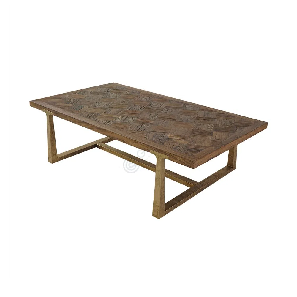 Supporting the wooden top is a robust iron base. The base is finished in an antique brass tone, which adds a subtle warmth and elegant contrast to the wood. Its striking X-shaped cross design provides both stability and a refined aesthetic.