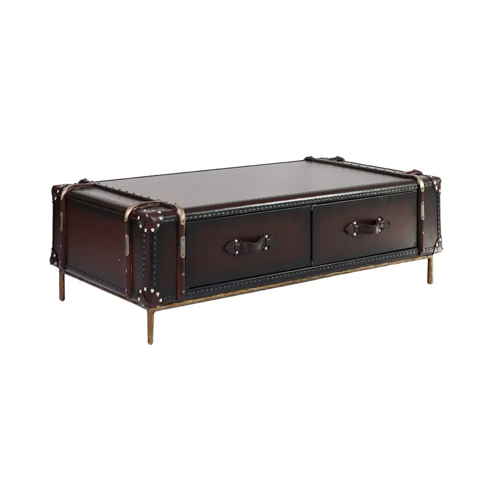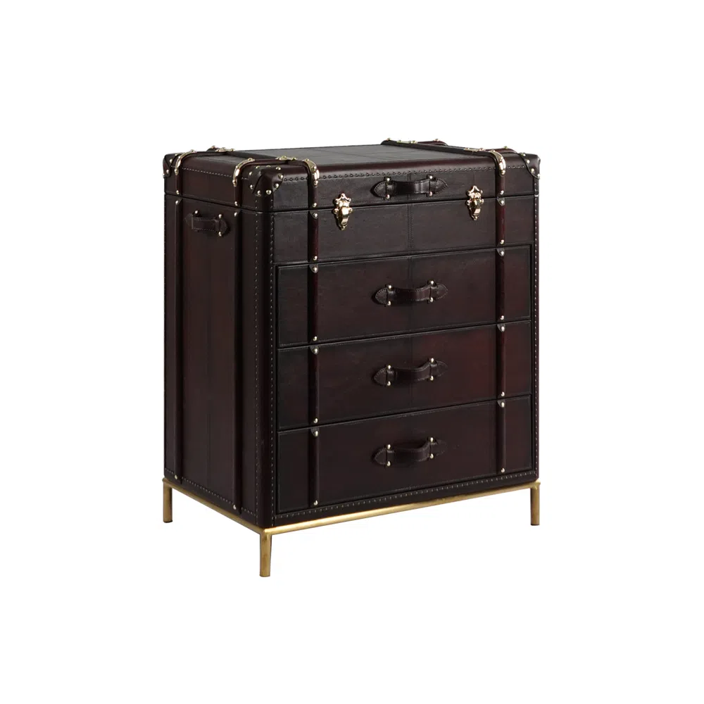 Crafted with solid wood for its sturdy core, the piece is then artfully covered in premium leather, giving it a tactile and inviting presence. Strong iron hardware, including decorative straps and a substantial, wrapped leather handle for its functional drawers, highlights its Loft style influence. The slender yet durable iron legs provide a refined base, elevating the design.