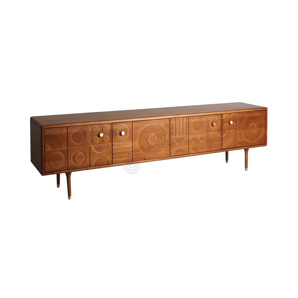 A striking element is the dynamic geometric pattern intricately carved across the facade. Concentric circles and abstract forms create a visually engaging mosaic on the various drawer and door fronts, ensuring each section offers a unique visual appeal. Small, round brass pulls subtly punctuate the design, adding a refined touch that beautifully complements the warm wood tones. Tapered, splayed legs, capped with brass accents, further enhance its distinct modern eco-style character.