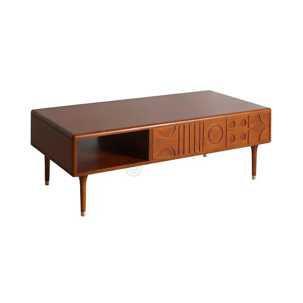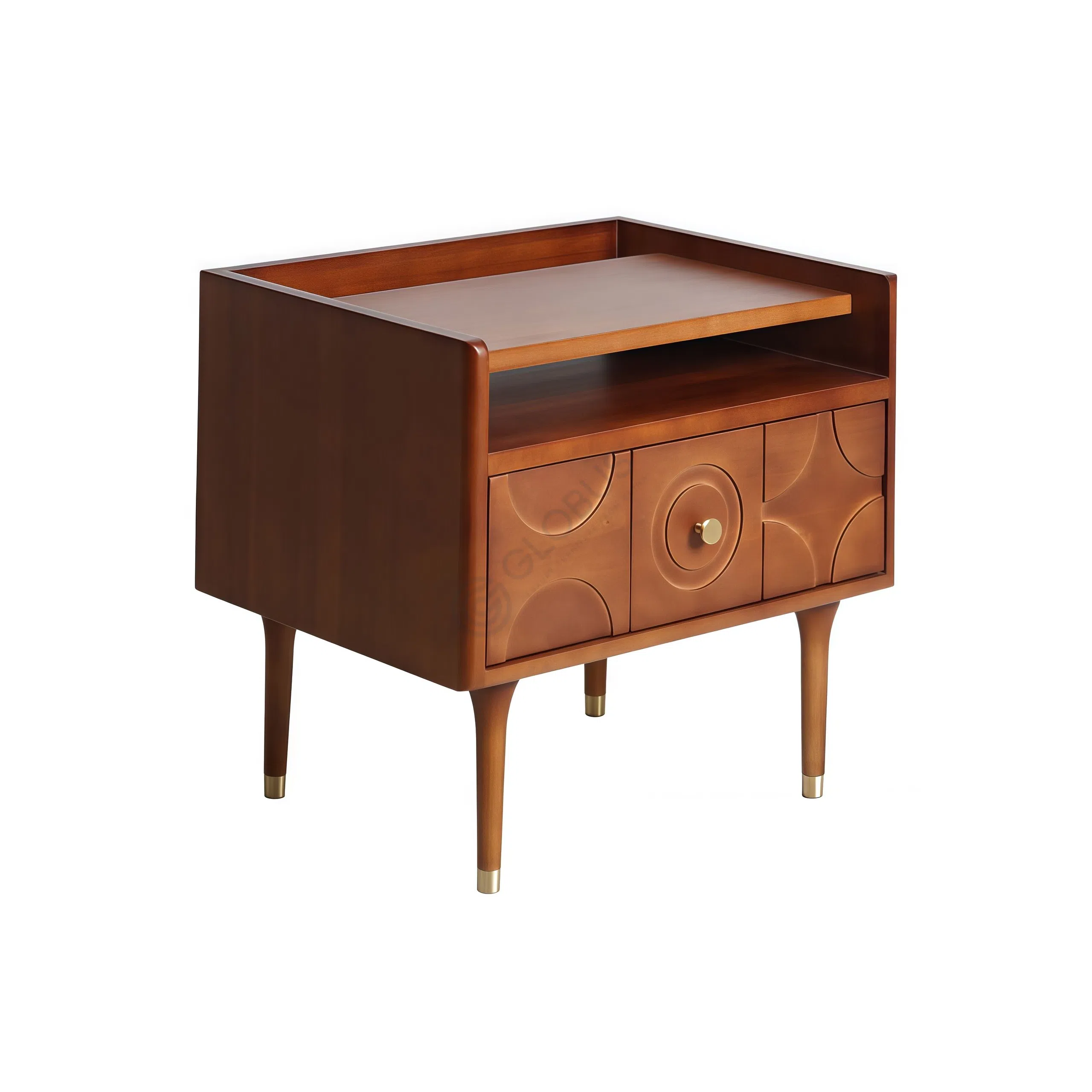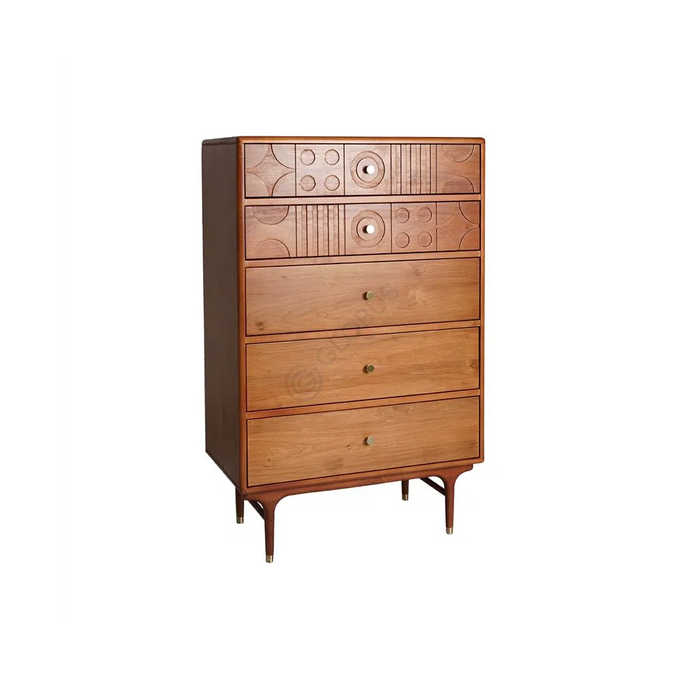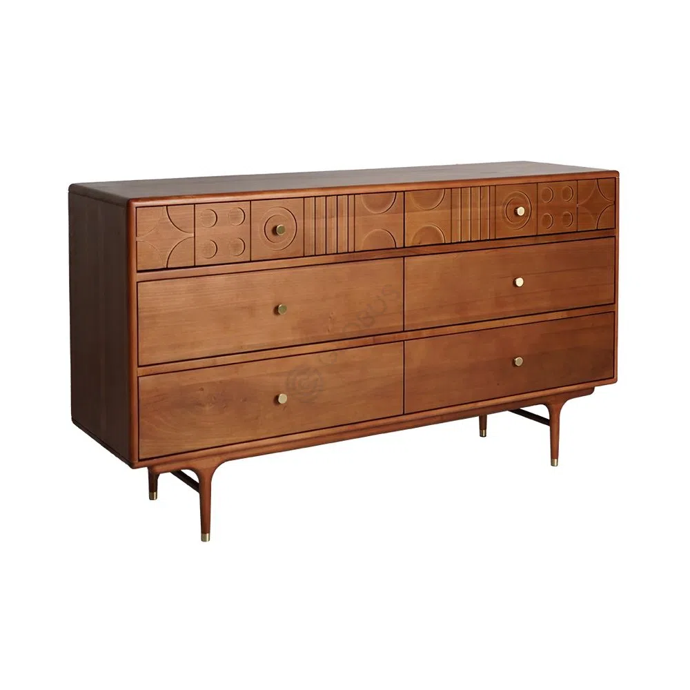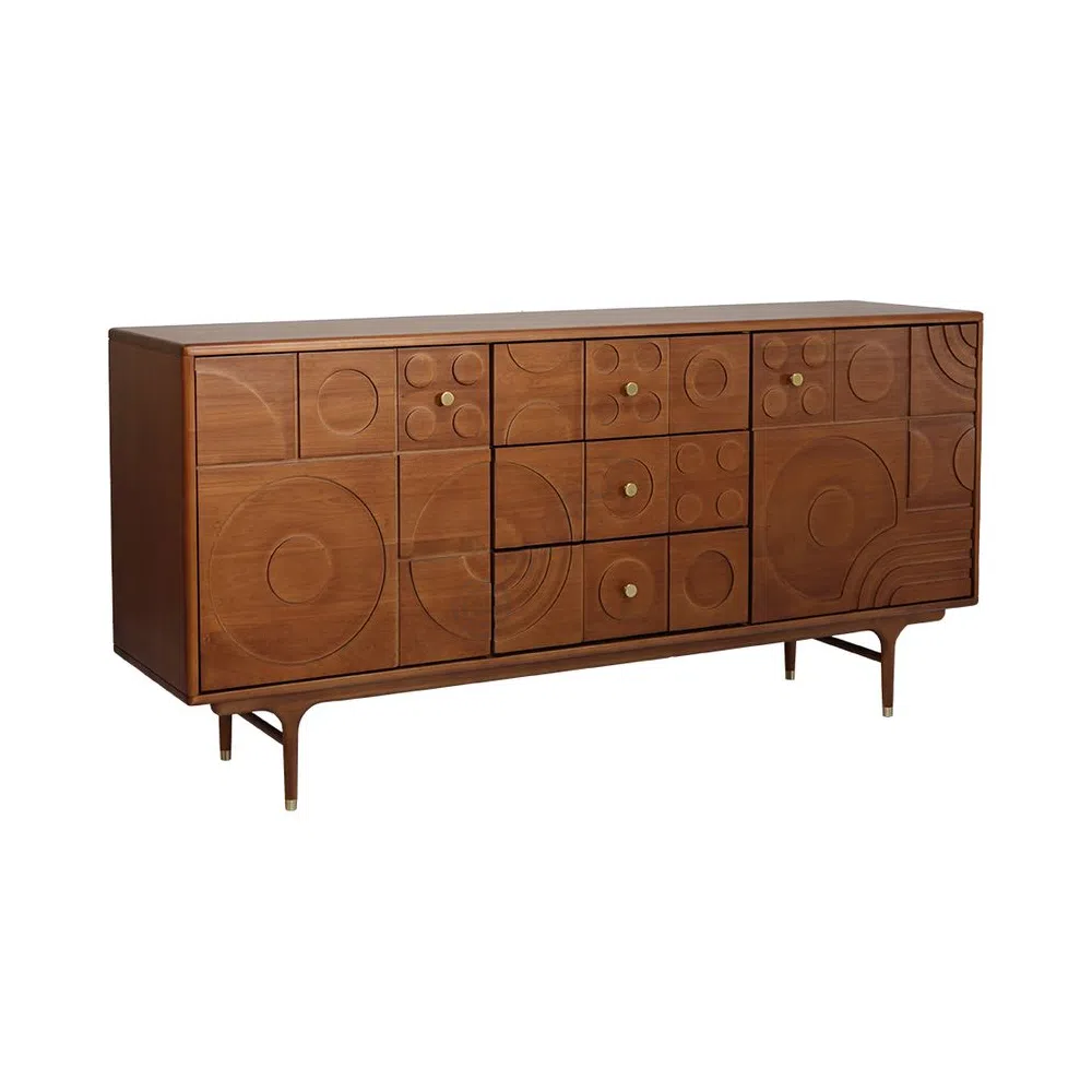 The front of the unit features a captivating arrangement of carved geometric patterns. Circles and linear elements interlock across its surface, creating both visual interest and a unique texture. Subtle round knobs, some with a soft metallic gleam, are seamlessly integrated into this artistic design. The entire piece rests gracefully on slender, tapered legs, which enhance its light and refined silhouette.