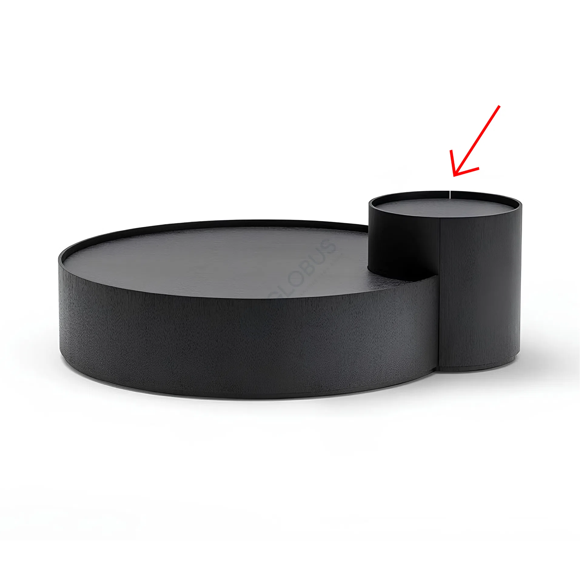 The intelligent design provides ample surface area on its expansive, low round top, ideal for displaying decor or holding refreshments. Complementing this, an integrated cylindrical element rises beside it, serving as an elevated side table. This taller section thoughtfully conceals an open storage compartment, perfect for maintaining a tidy living space by keeping smaller items neatly accessible.