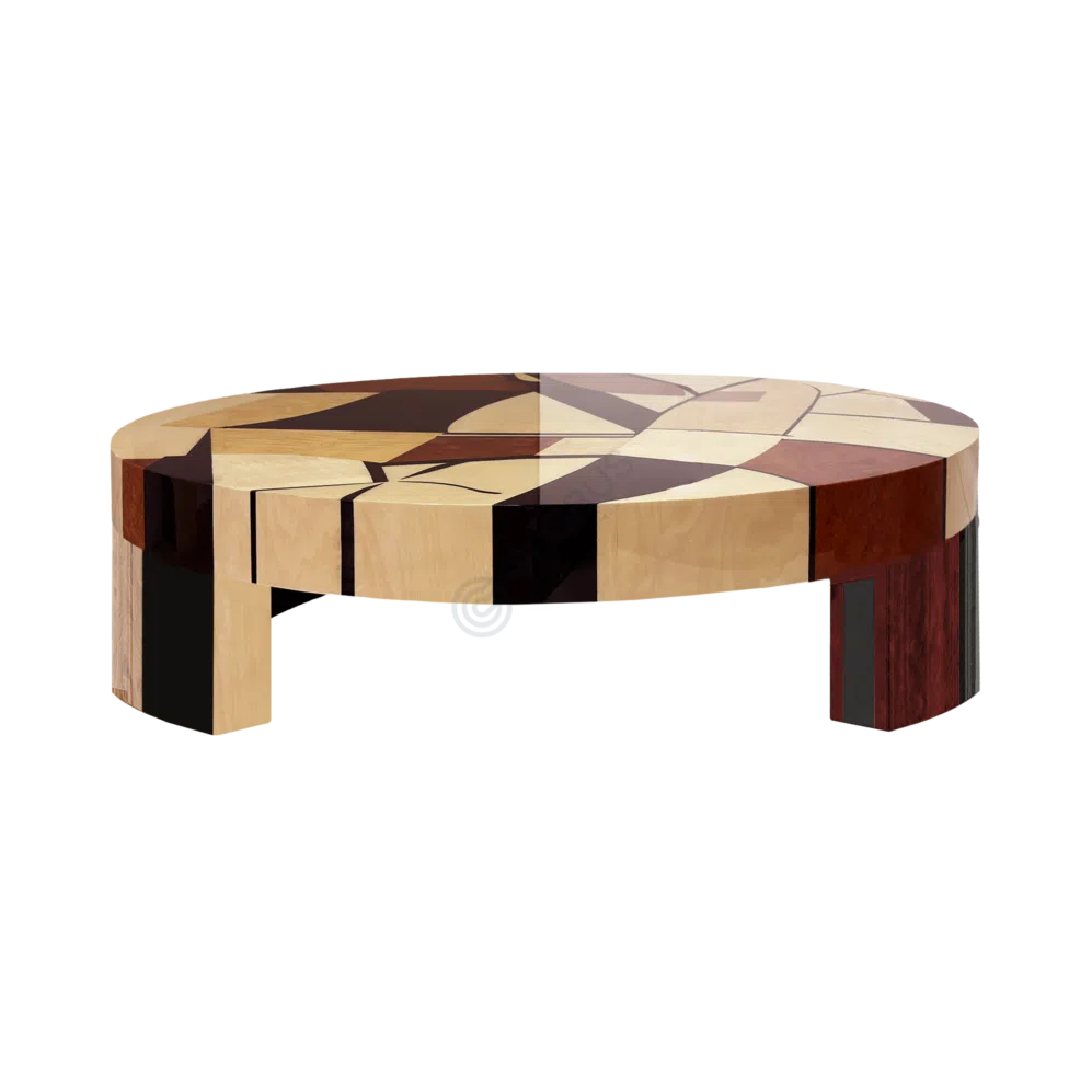 Crafted from solid wood, the table showcases exceptional artistry. The circular top features a meticulous geometric inlay, where different wood tones – ranging from warm auburns and natural light grains to rich blacks – are arranged in a captivating pattern. This detailed craftsmanship continues along the table’s sides, with sleek vertical wood grains contrasted by subtle dark lines, all finished with a high-gloss lacquer that enhances its luxurious appeal.