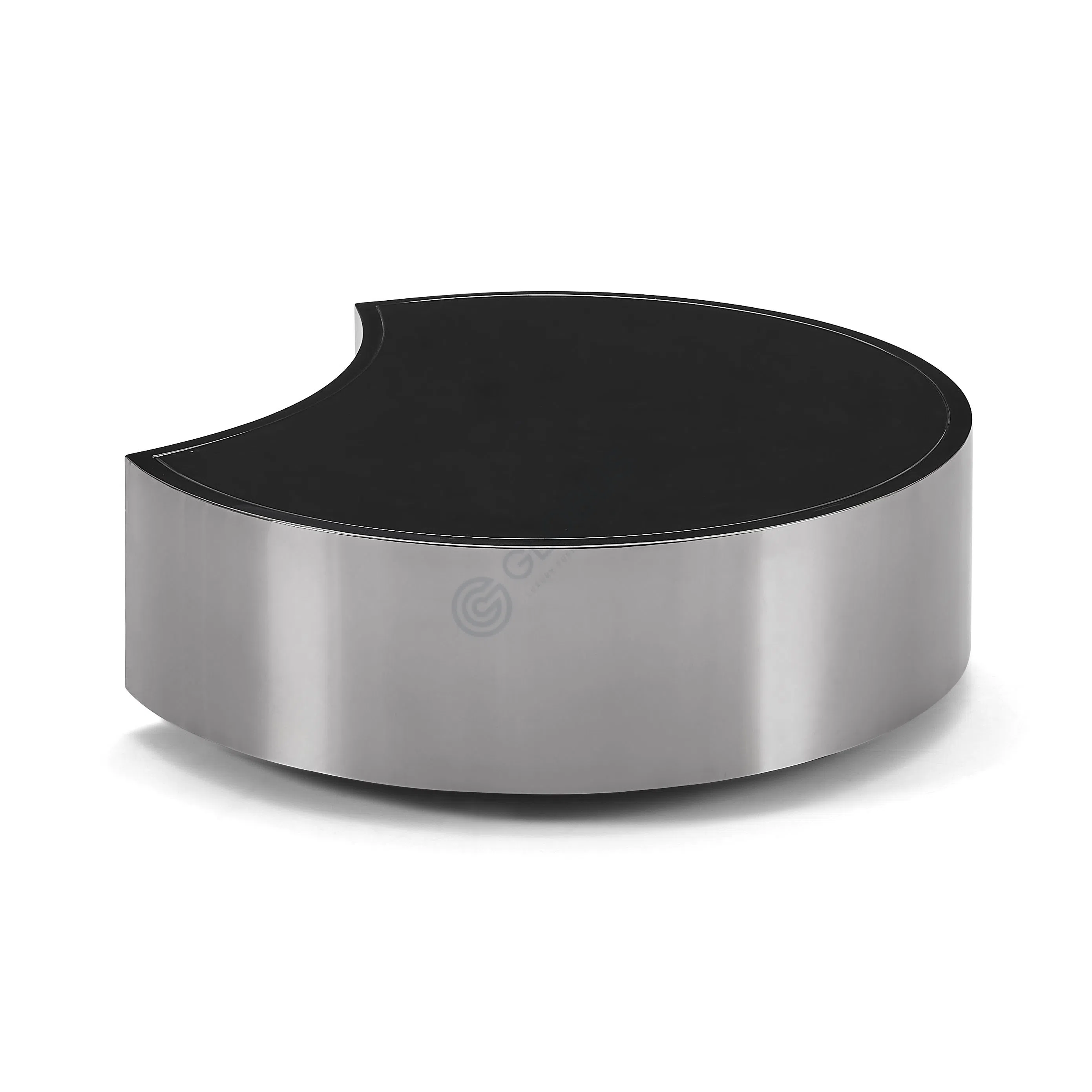 A cylindrical side table crafted from mirror-polished stainless steel and crowned with a black tempered glass top. The seamless joint between metal and glass highlights a minimalist silhouette that complements modern living rooms.
