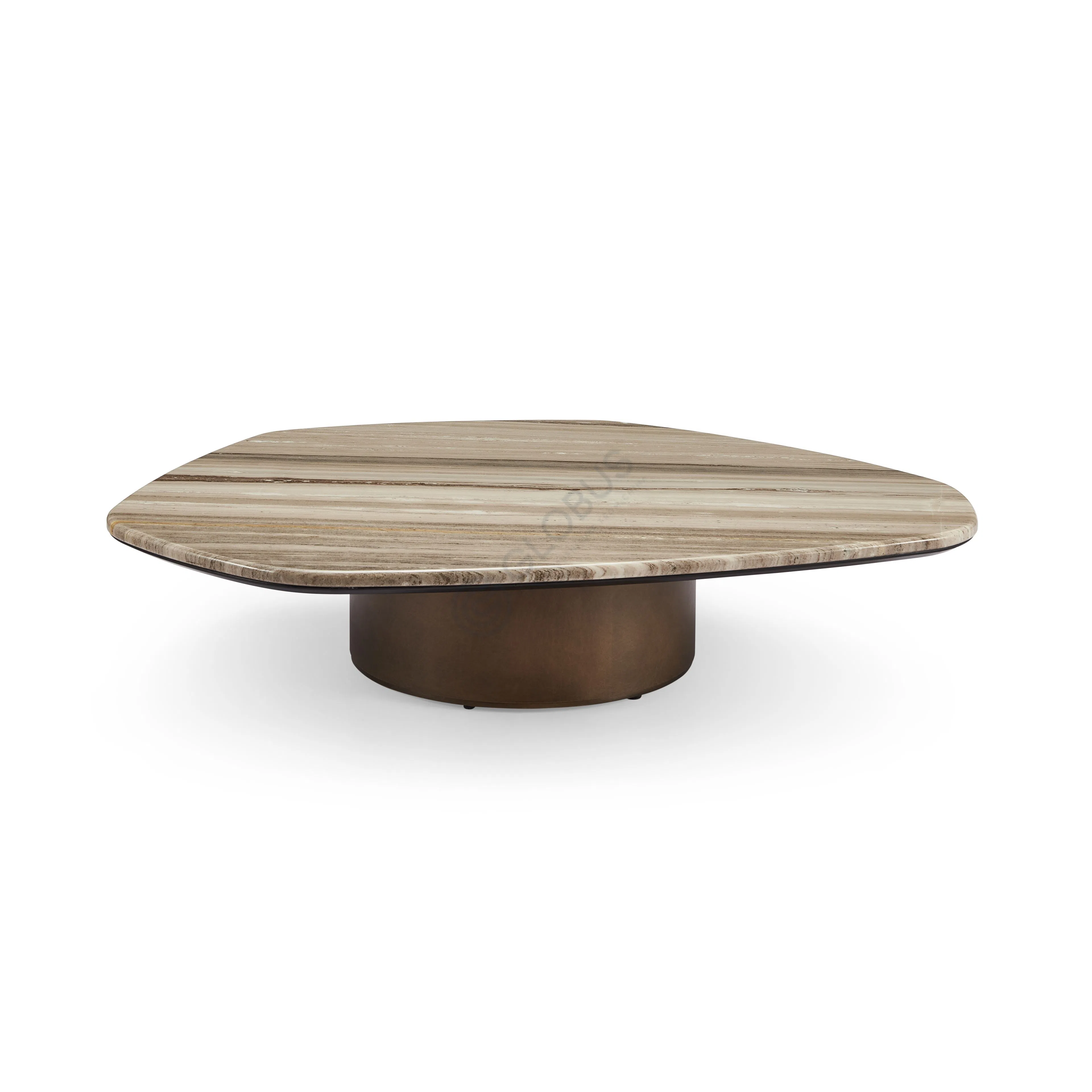 The side table presents an organically shaped natural marble top defined by warm beige and brown veins. A gentle polish brings out the stone’s texture and subtle sheen.