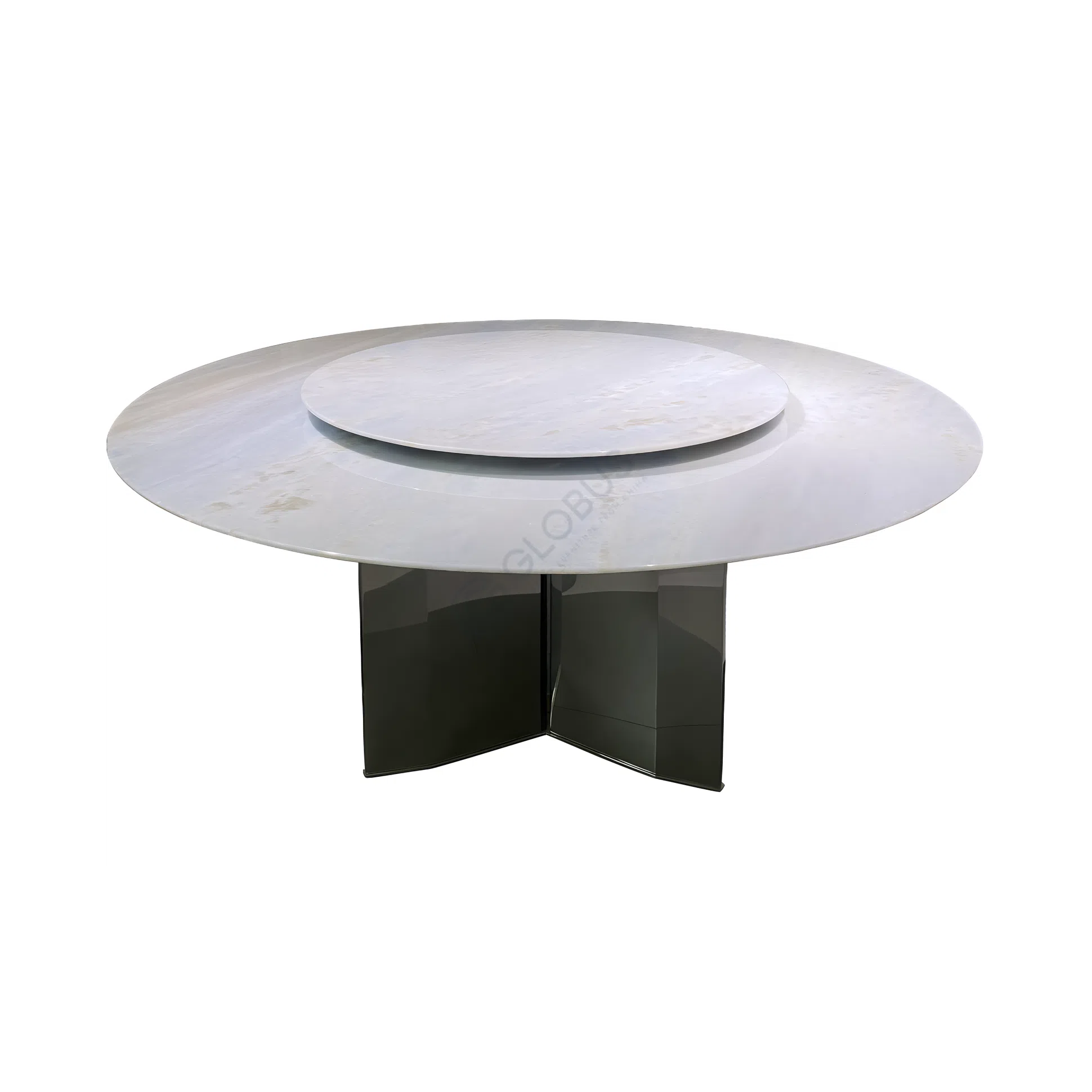 Supporting this exquisite top is a robust base crafted from stainless steel. Its dark finish provides a striking contrast to the luminous marble. The two distinct pedestal-style legs are geometrically designed, offering exceptional stability while maintaining an open, airy feel. This substantial yet elegant base reinforces the table's modern aesthetic.