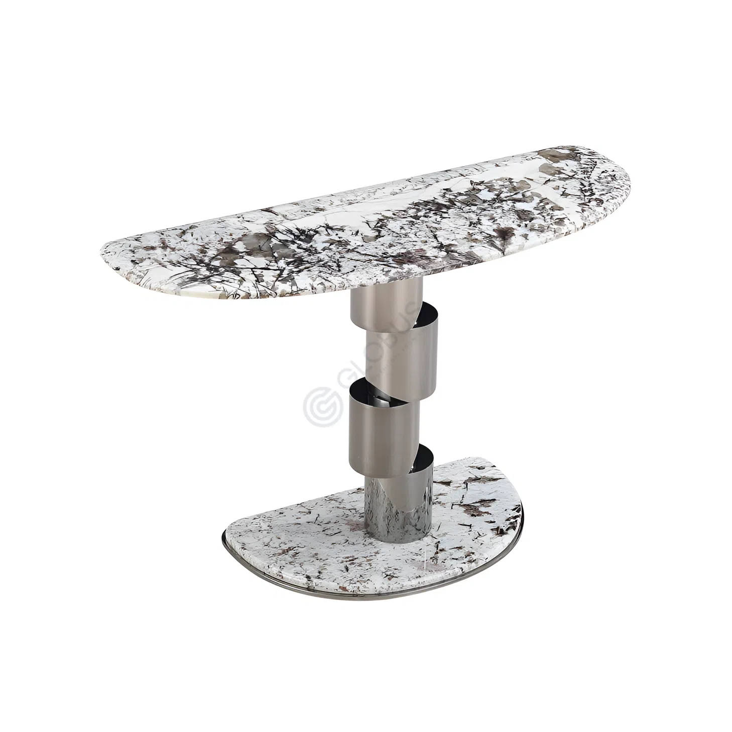 Supporting this elegant surface is a sculptural base crafted from high-quality stainless steel. The base features a distinctive design of stacked and spiraling forms, rendered in a brilliant, reflective chrome finish. This contemporary structure provides not only robust stability but also a captivating visual element that catches the light and adds a dynamic presence to the room.