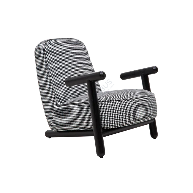 A modern pouf upholstered in black-and-white houndstooth textile rests on four short, round solid wood legs. Its frame combines plywood and solid wood for a sturdy foundation, while the plush foam padding ensures comfortable seating or a gentle footrest.