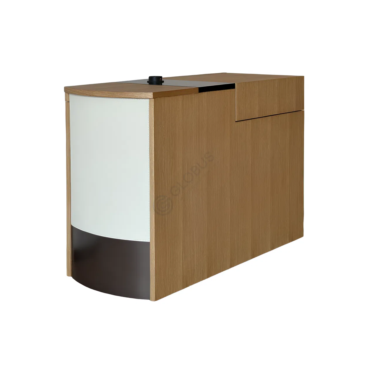 The table features a top crafted with natural wood veneer, offering a warm and inviting surface. Supporting this design are two robust legs, each beautifully adorned with natural marble panels that introduce a touch of refined luxury. Subtle integrated LED lighting enhances the table's presence, casting a gentle glow that highlights its intricate details and surrounding decor. The construction combines solid wood and plywood for enduring stability, complemented by sleek stainless steel accents for a polished finish.