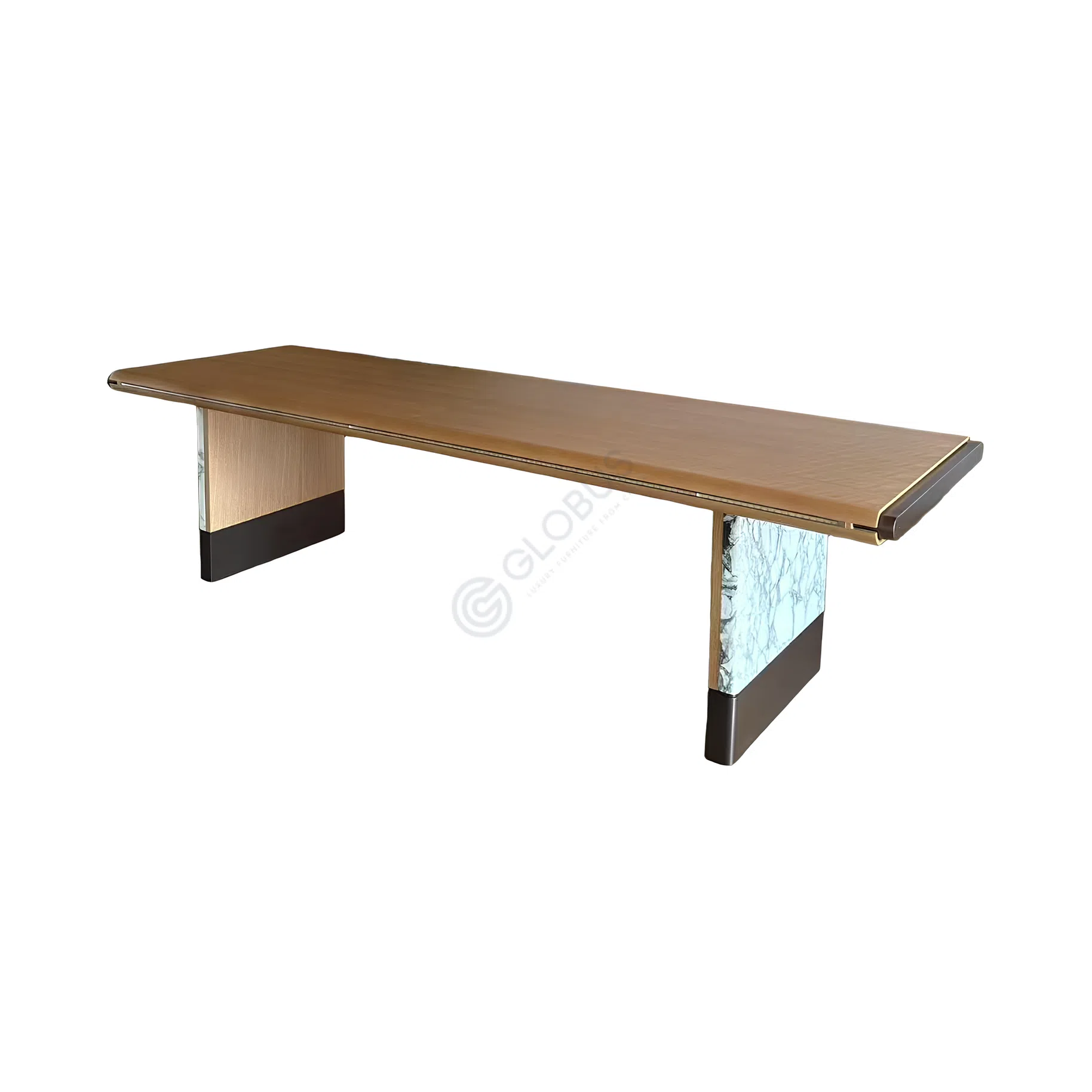 This modern cabinet or sideboard presents a sophisticated profile with its clean lines and warm wood finish. It is carefully crafted from solid wood and plywood, featuring a beautiful natural veneer that highlights the wood's inherent grain.