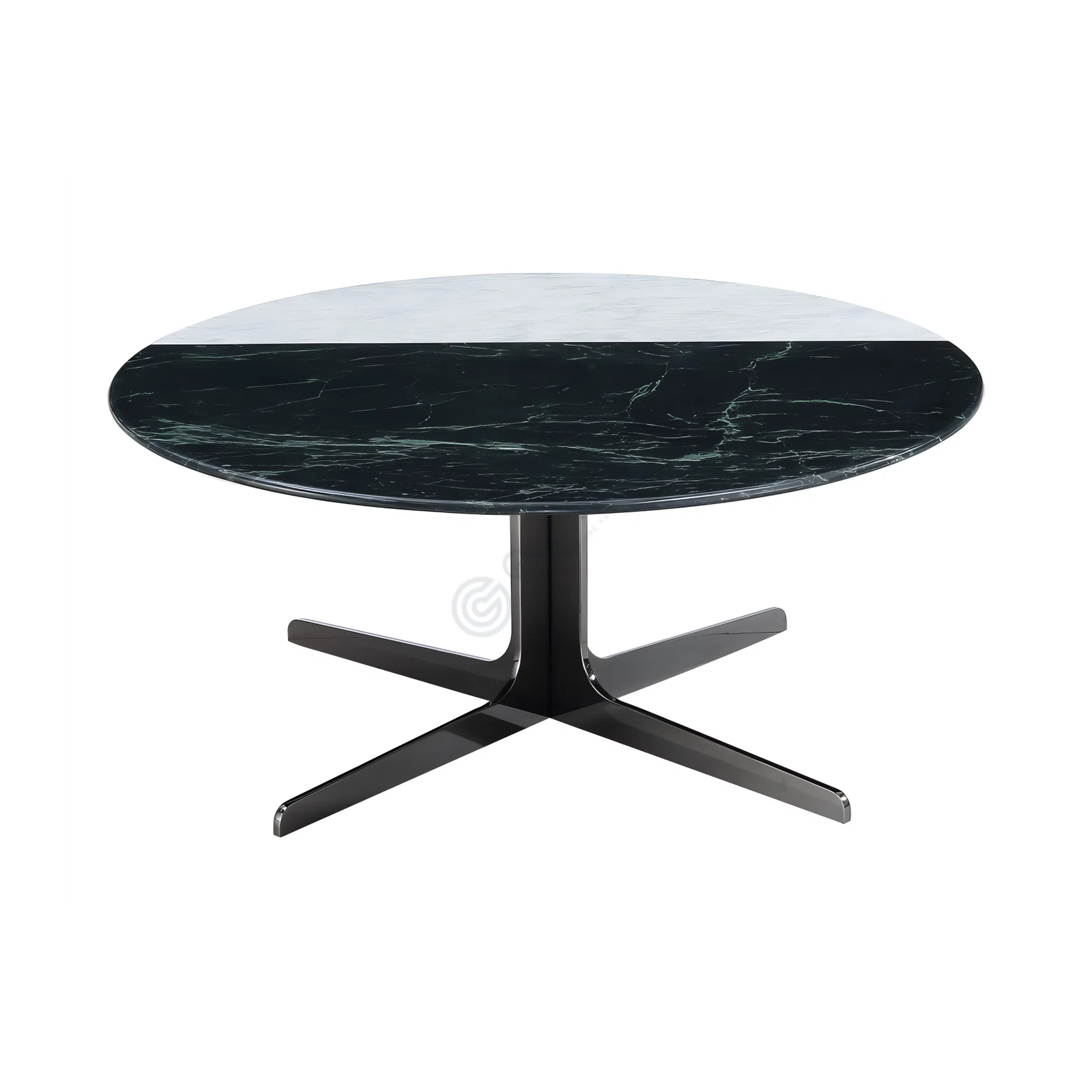 The tabletop features premium sintered stone, prized for its durability and intricate design. This unique stone is enhanced by a sleek glass finish, which provides a lustrous sheen and a protective layer, highlighting its natural beauty. Supporting this elegant top is a polished stainless steel pedestal, rising from a sturdy four-point base. The metallic finish of the base offers a refined contrast to the organic patterns of the top, ensuring both stability and a visually light presence.