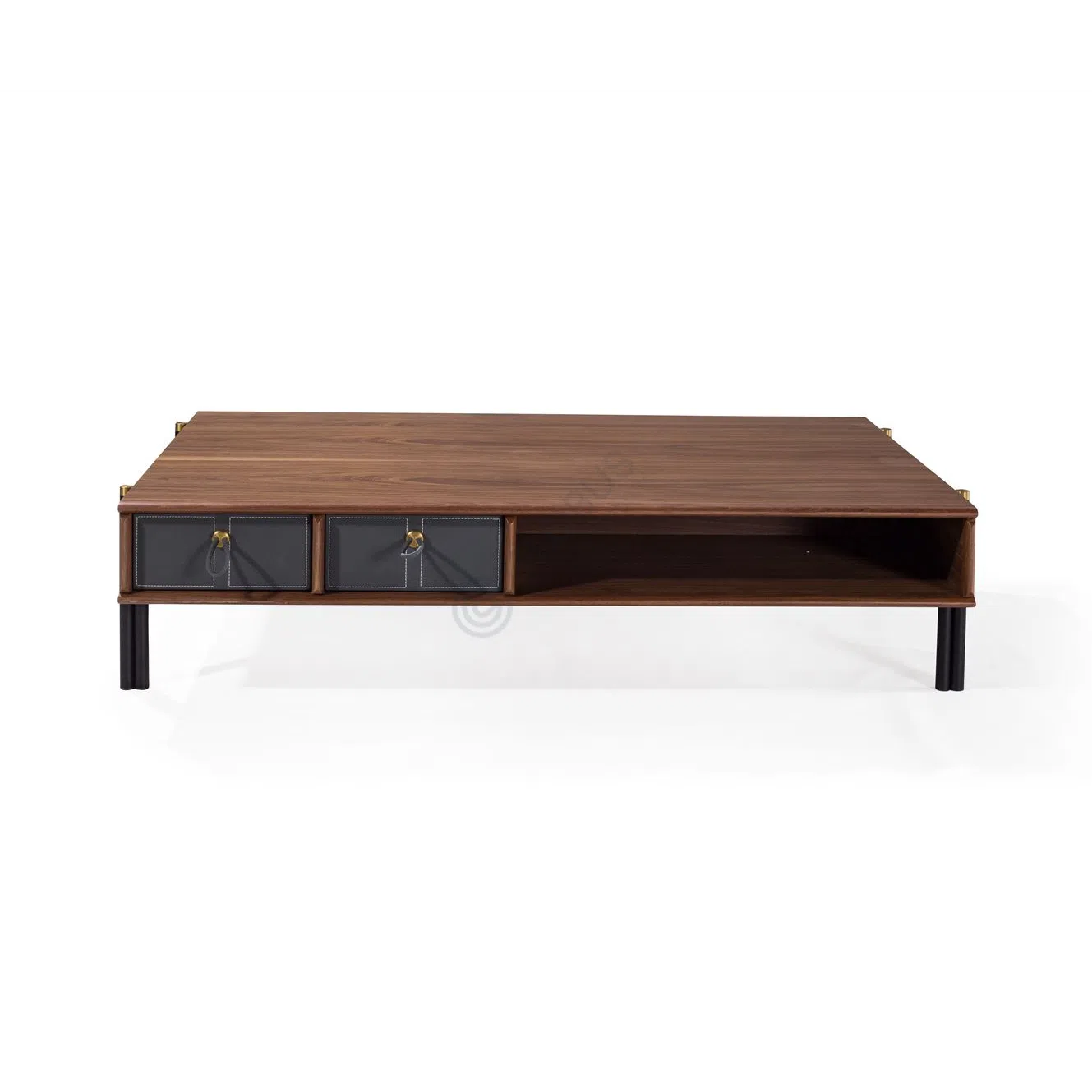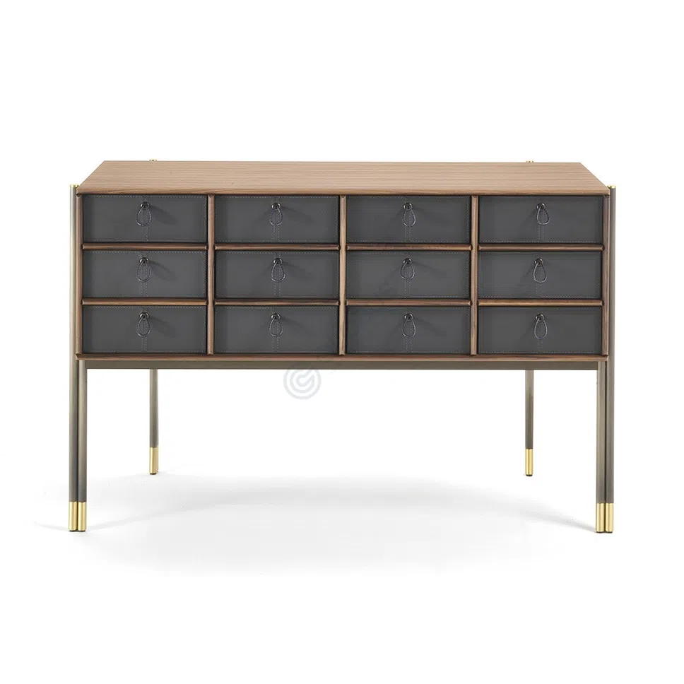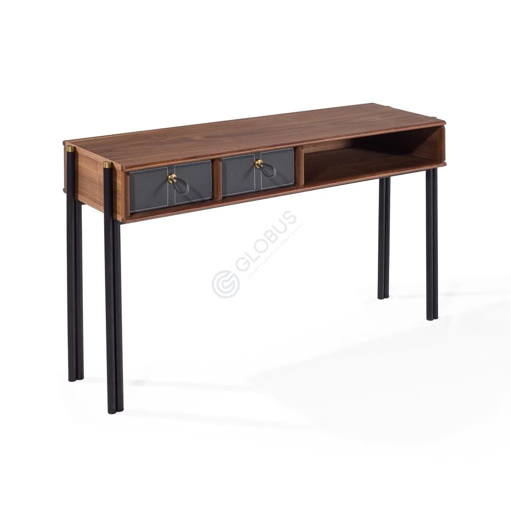 Two drawers offer practical storage for books, glasses, and chargers. The leather fronts feel pleasant to the touch, and the robust construction keeps the piece stable and quiet in daily use.
