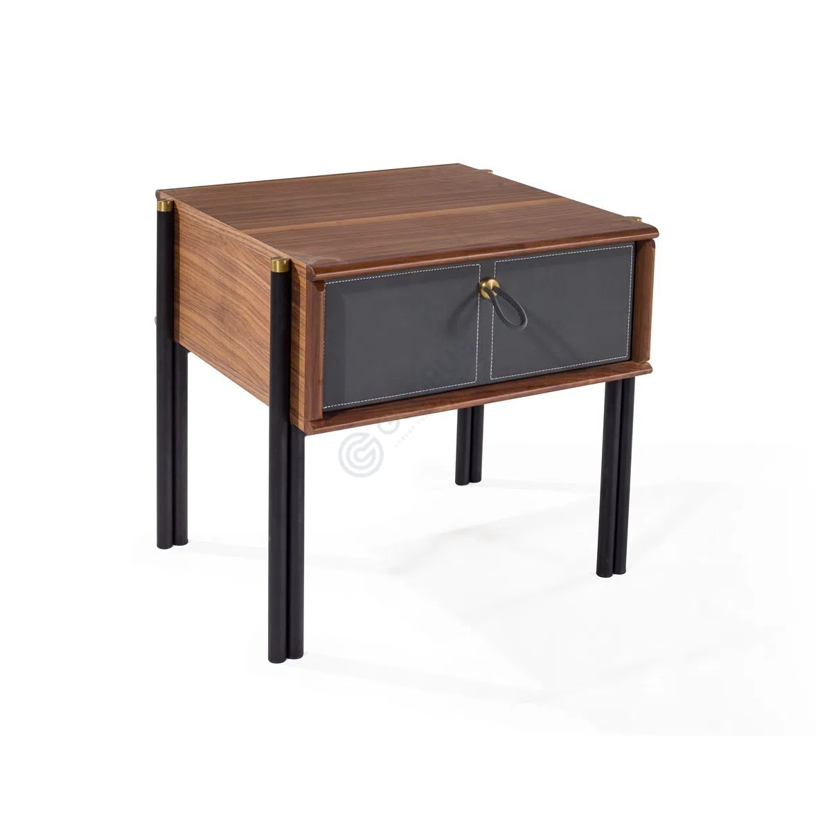 A modern bedside table with a warm natural-veneer case over sturdy plywood, contrasted by smooth saddle-leather drawer fronts. Precise topstitching and looped pulls lend a tailored look, while slim stainless-steel legs with subtle gold-tone accents give a light, elevated stance.