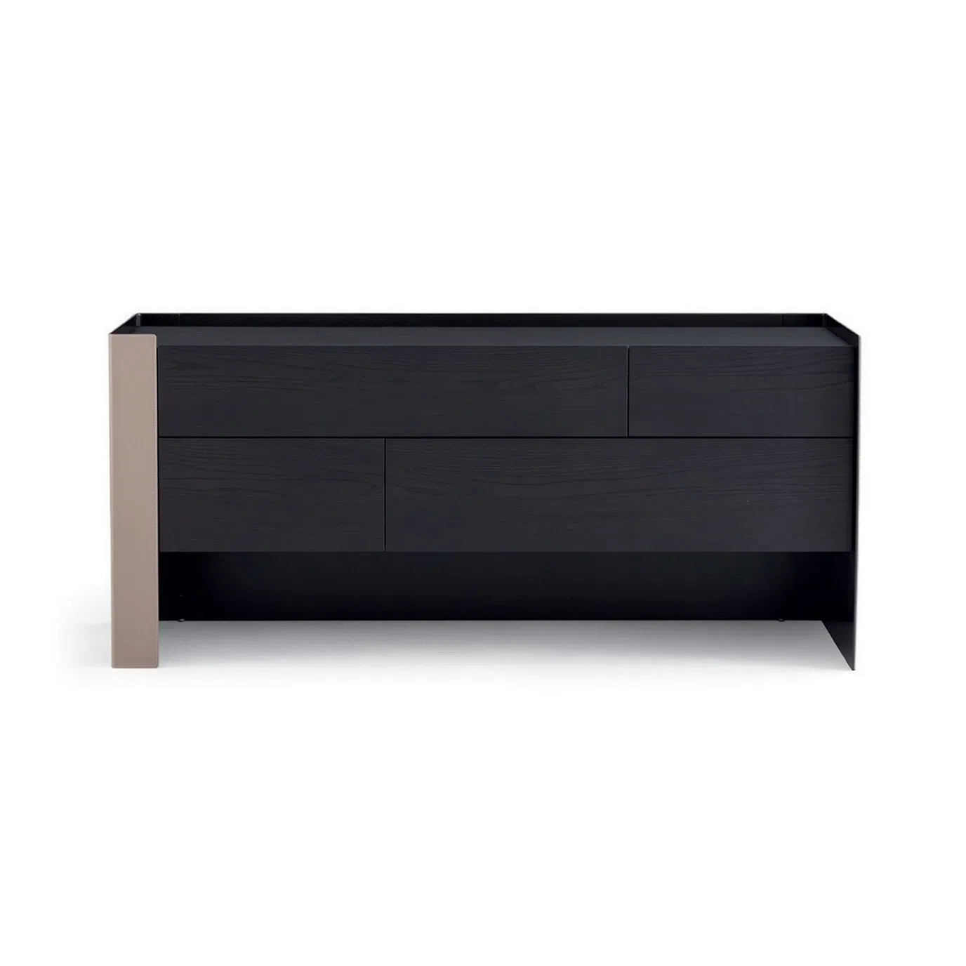A refined modern dressing table with a clean asymmetric silhouette. A slim, cantilevered top rests over an offset pedestal of three drawers, creating an airy work surface with generous legroom. The warm taupe outer panels contrast with a deep, espresso-toned drawer block for a composed, contemporary look in the bedroom.