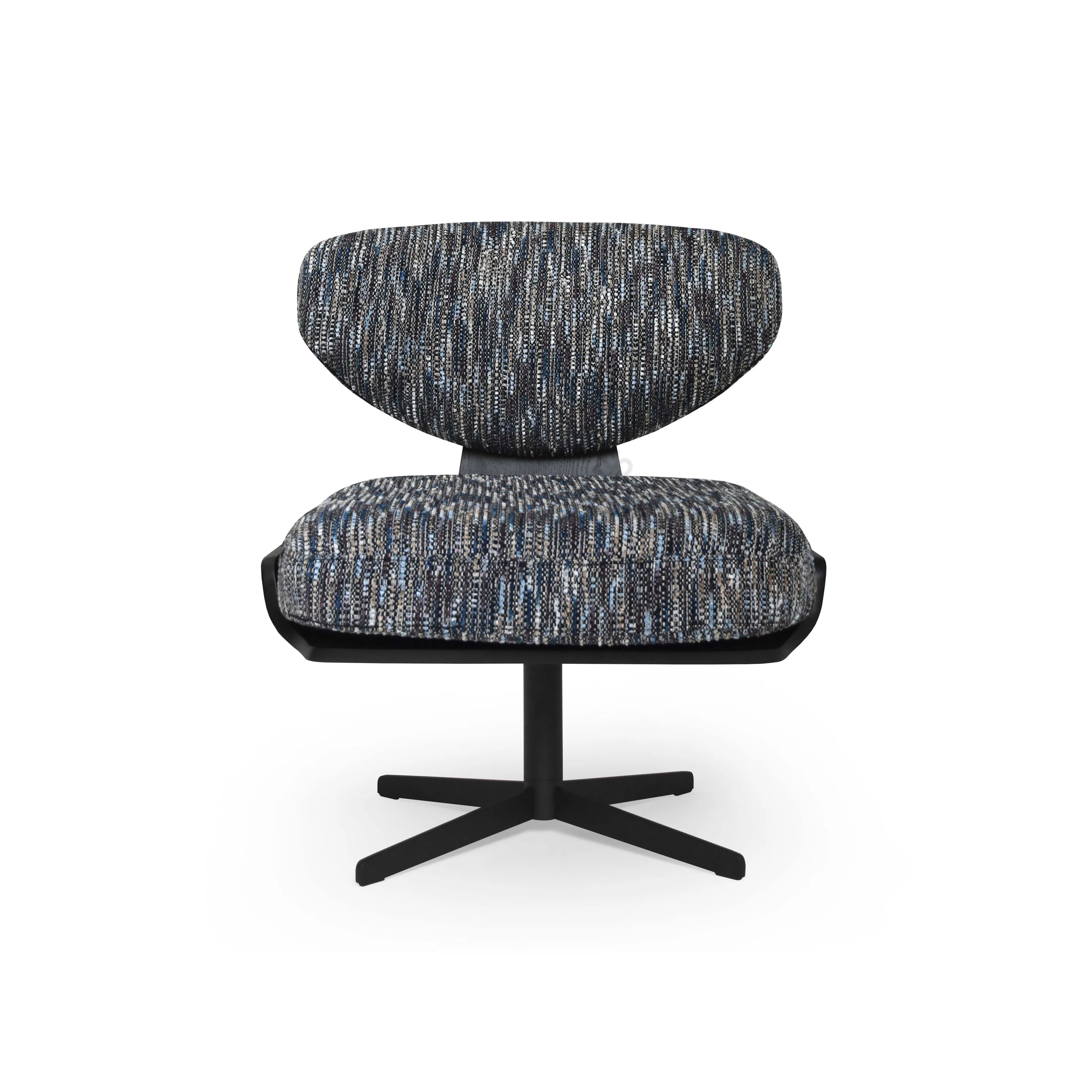Crafted with attention to detail, the chair features a beautifully textured textile upholstery for both the seat and the organically shaped backrest. This fabric is complemented by the rich warmth of natural veneer, carefully applied to the plywood frame, adding a touch of sophisticated natural appeal. The sturdy metal base, finished in a dark, understated tone, provides a strong foundation and features a slim, polished footrest for added convenience.