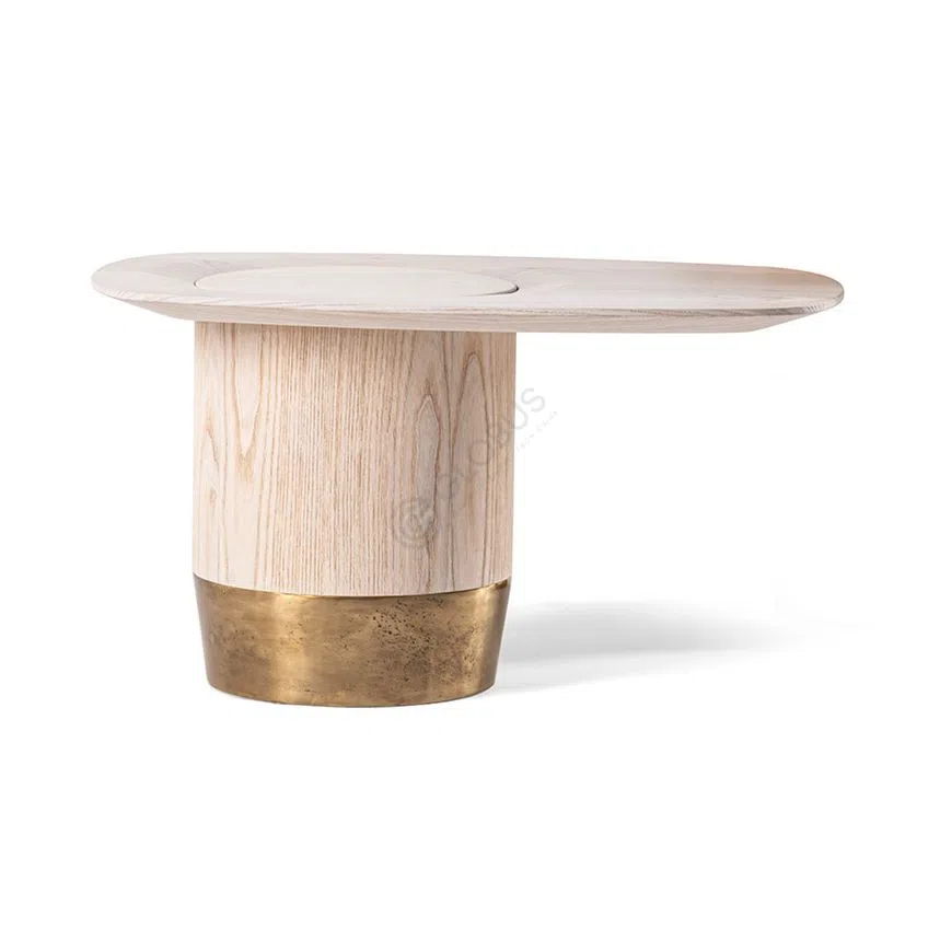 A refined copper disk is thoughtfully set into the center of the marble surface, providing a warm, metallic contrast that highlights the cool elegance of the stone. This detail adds depth and visual interest to the tabletop.