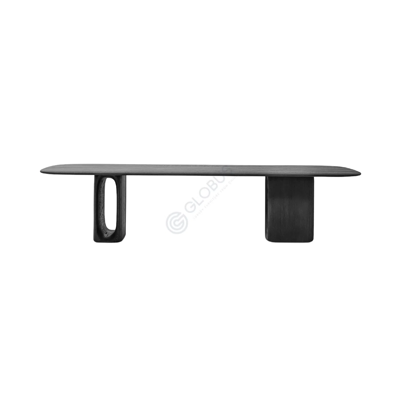 The design showcases broad, smoothly finished shelves in a warm, inviting tone. These horizontal planes are elegantly supported by dark, sculptural vertical elements. Each support features a unique, elongated oval cutout, adding visual intrigue and a sense of lightness to the solid structure. This thoughtful interplay of form and negative space defines its unique character.
