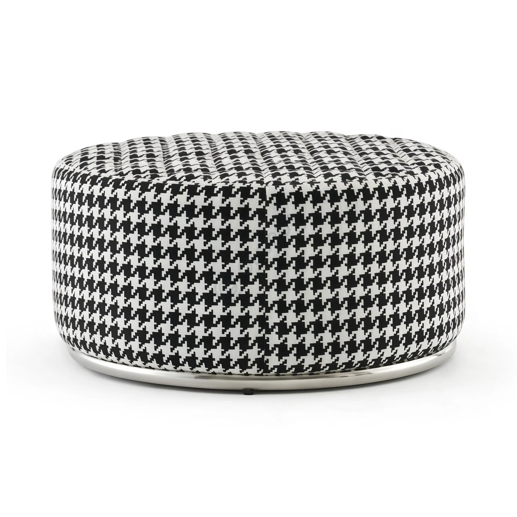 This modern pouf features a distinctive square silhouette with gracefully rounded edges, upholstered in a classic black and white houndstooth textile. Its iconic pattern brings a timeless sophistication, making it an effortlessly stylish accent for any contemporary space.